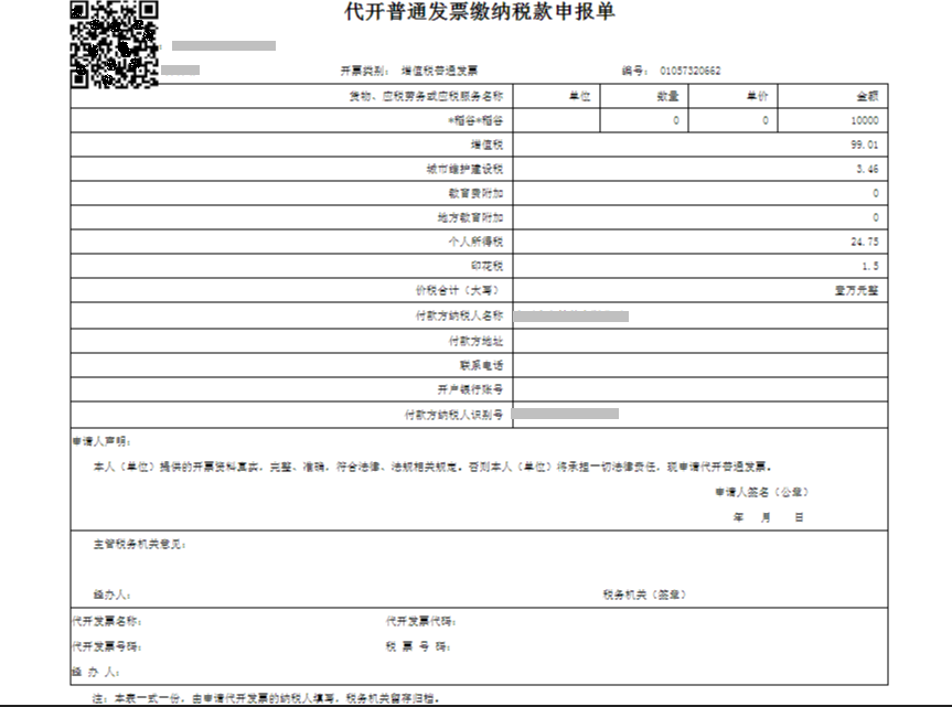 备注1系统根据纳税人代开发票的商品编码判断该业务是否属于销售货物,若是则默认带出“个人所得税由纳税人(开票人)依法自行申报缴纳”;若否则默认带出“个人所得税由扣缴义务人(支付方)依法预扣预缴或代扣代缴”,不可修改。