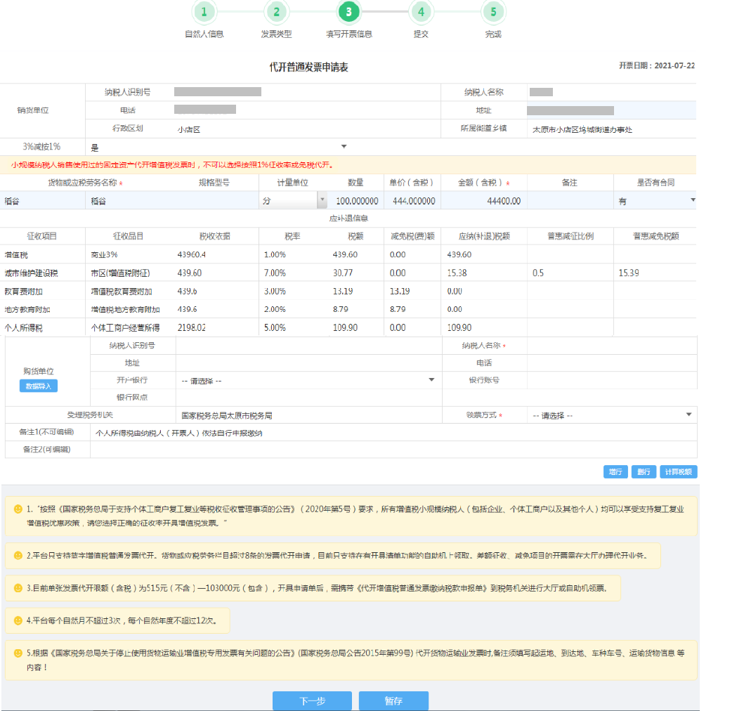 6.代开发票申请信息录入。进入界面后进行开票信息填写,填写完成后点击“计算税额”,系统自动计算增值税、城市维护建设税、教育费附加、地方教育费附加、印花税的税额。