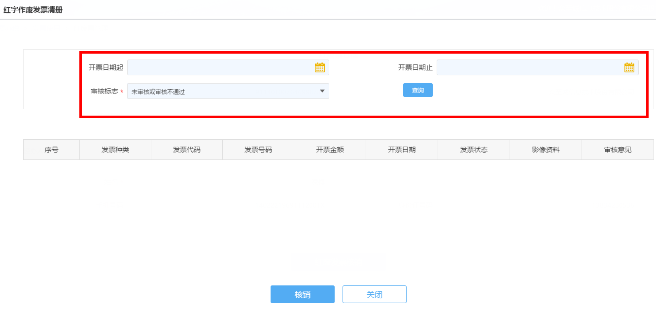 4.选择开票起止日期及审核标志,点击查询,查出结果后点击核销即可。