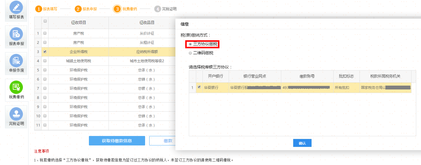 缴款方式支持三方协议缴款,若申报后有应征税款的,在点击“获取缴款信息”可带出相应税款。点击“缴款”可完成税款缴纳,如图