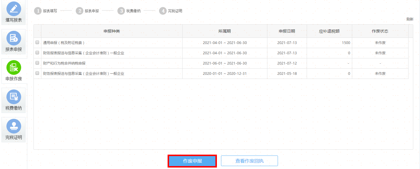 提示:作废申报表后,点击〖查看作废回执〗或〖刷新〗查看作废状态。