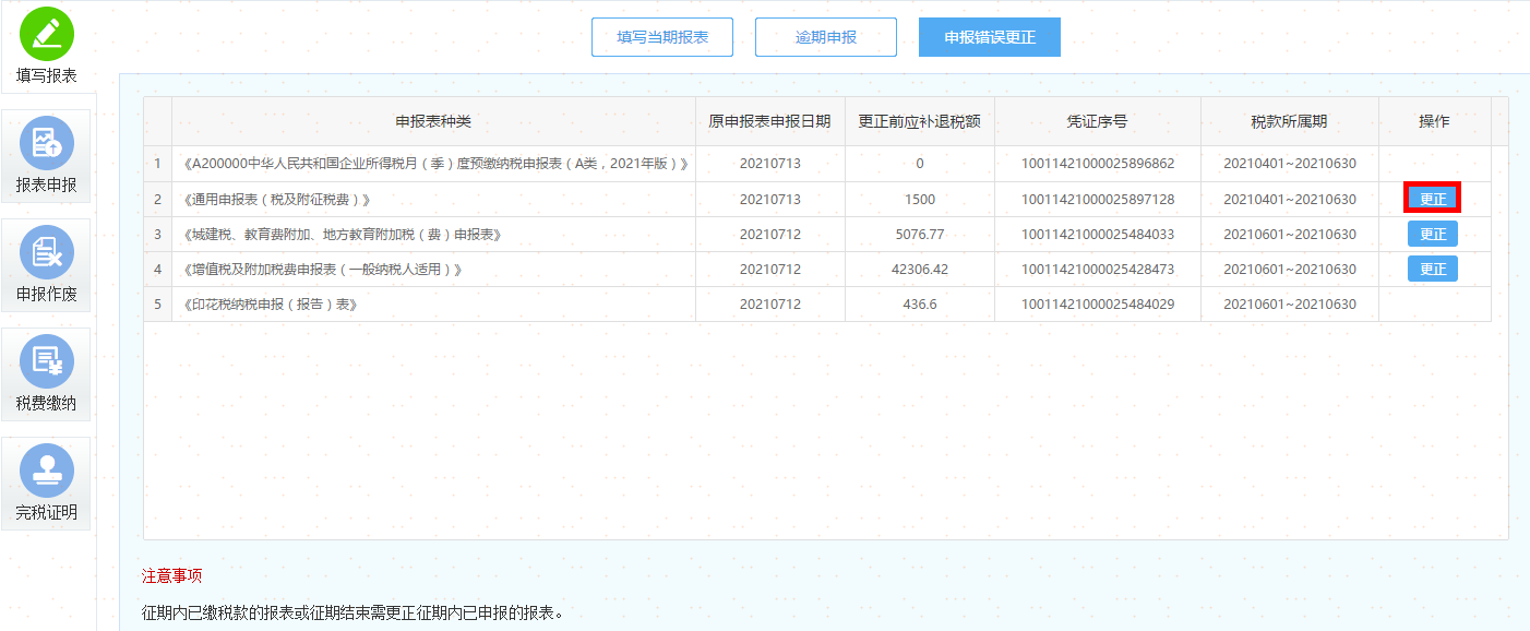 申报成功并已缴税后,可通过“更正申报”,进入后点击查改,进行更正。更正后,点击“报表申报”进行申报。如图