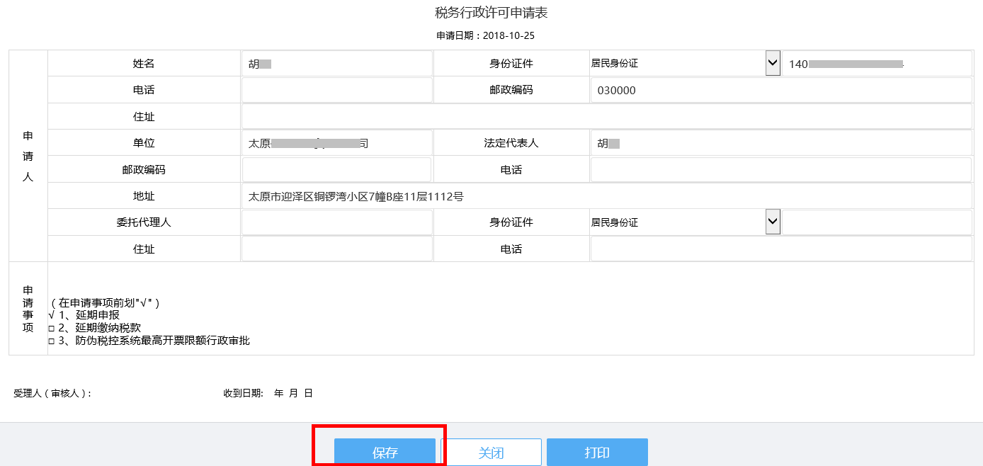 2.首先填写《税务行政许可申请表》,填写完成后,点击“保存”如图