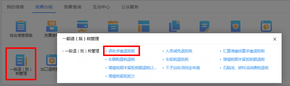 首页→〖我要办税〗→〖一般退(抵)税管理〗→〖误收多缴退抵税〗