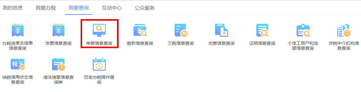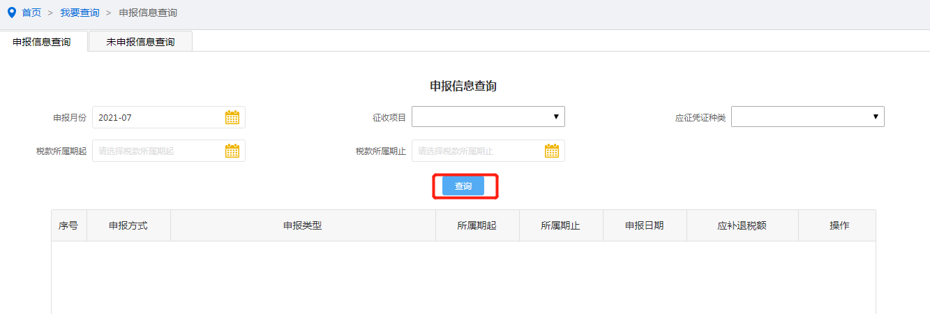 进入首页,在我要查询模块,点击申报信息查询,进入申报查询页面,选择申报月份、征收项目、应征凭证种类、税款所属期进行查询,点击“查询”可查询当期申报表的申报数据及打印报表。