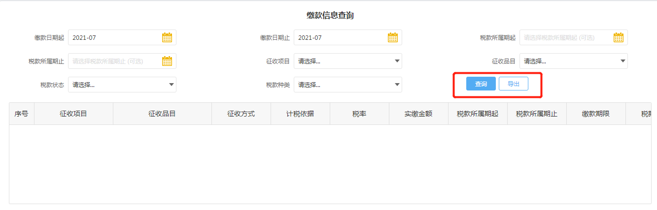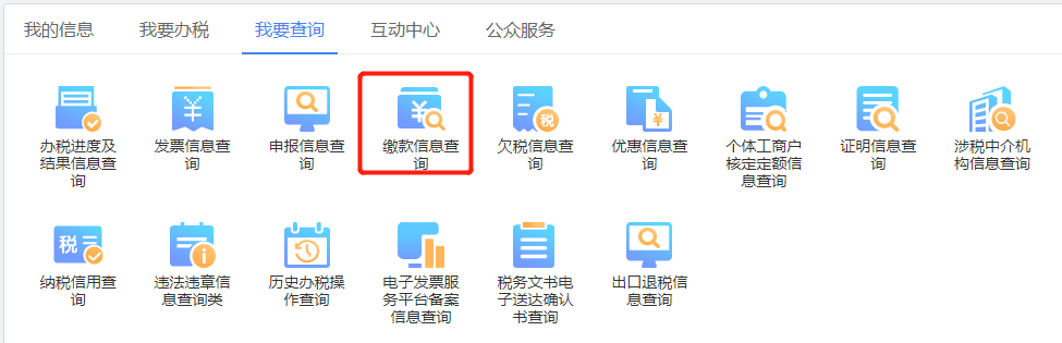 进入首页,在我要查询模块,点击缴款信息查询,进入缴款信息查询页面,选择税款所属期,可查询当期缴款数据。可按征收品目、税款种类、征收项目、税款状态分类查询缴款信息。
