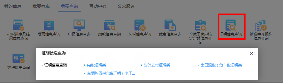 进入首页,在我要查询模块,点击证明信息查询,点击完税证明类,进入查询页面,支持打印、下载功能。