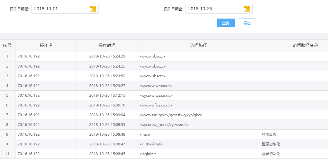 通过此功能,可以查询在一段时间内纳税人对平台操作各个模块记录。