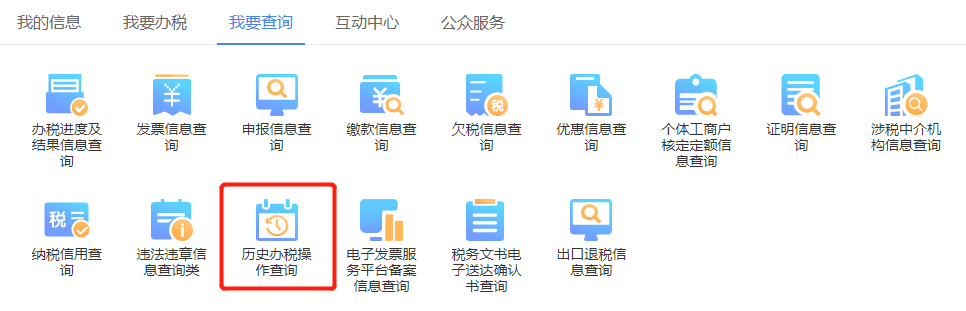 进入首页,在我要查询模块,点击历史办税操作查询,进入查询页面。