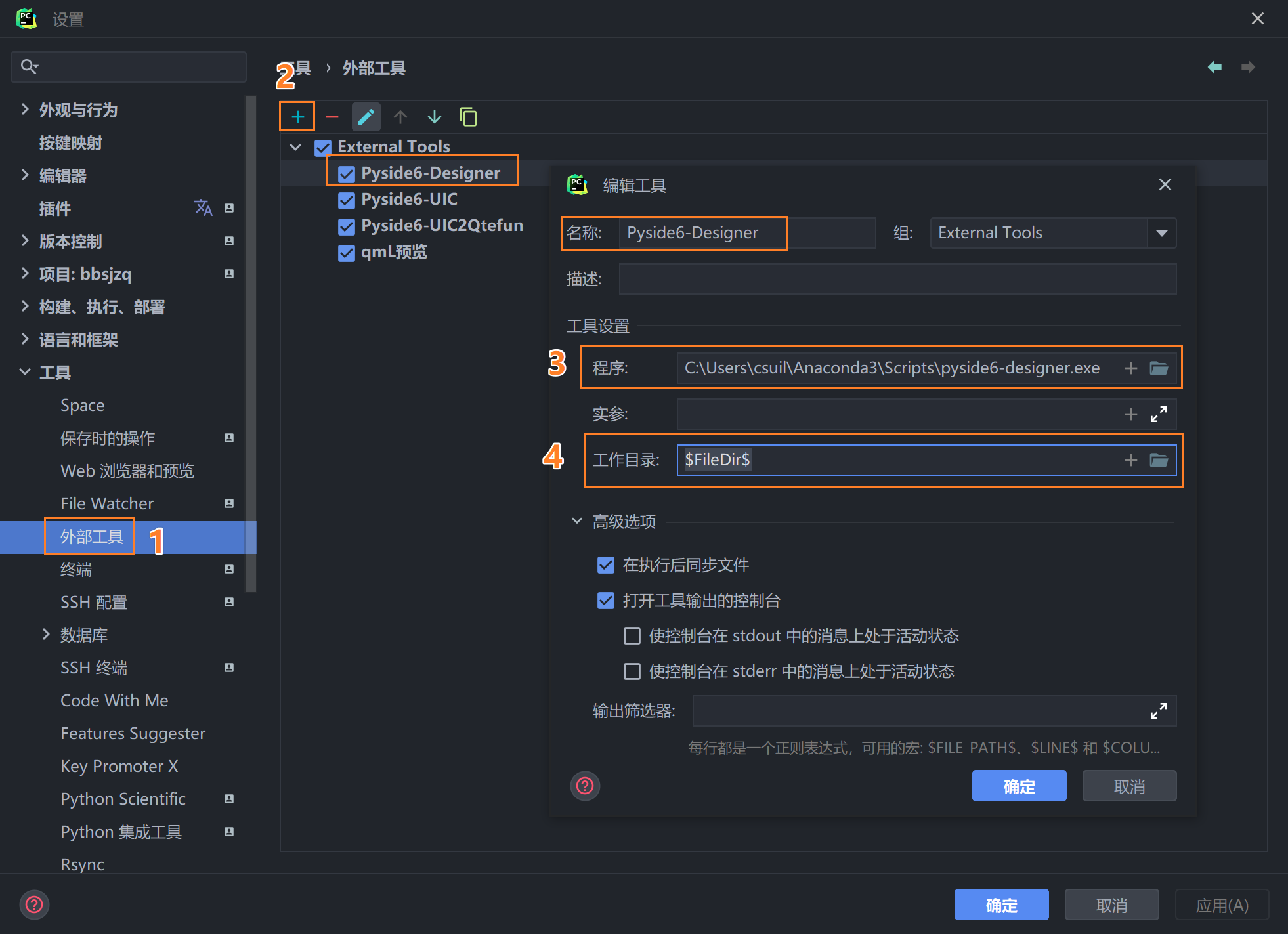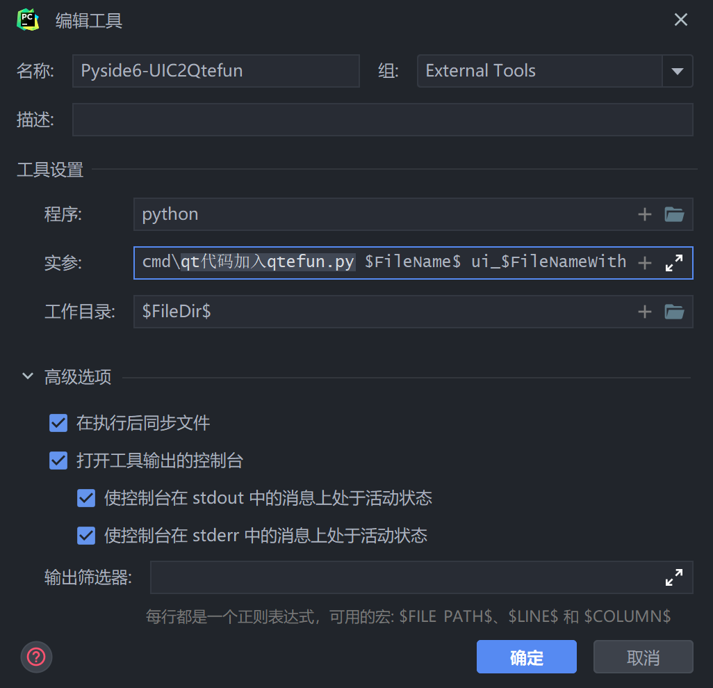 实参 `C:\pyefun\QtEsayDesigner\qtefun\cmd\qt代码加入qtefun.py $FileName$ ui_$FileNameWithoutExtension$.py "C:\Users\csuil\Anaconda3\Scripts\pyside6-uic.exe"`