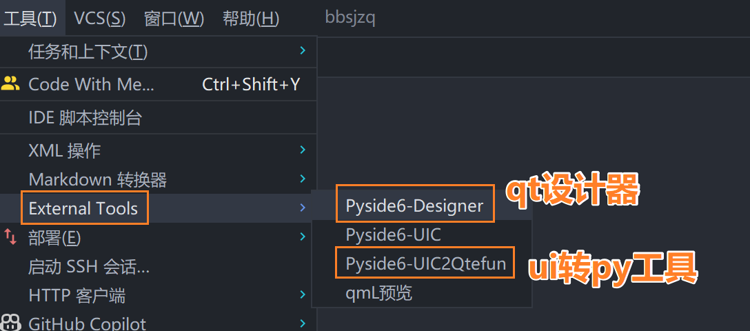 完成上述操作后在 pycharm中的菜单`工具` `external Tools` 就可以打开 qt的设计器