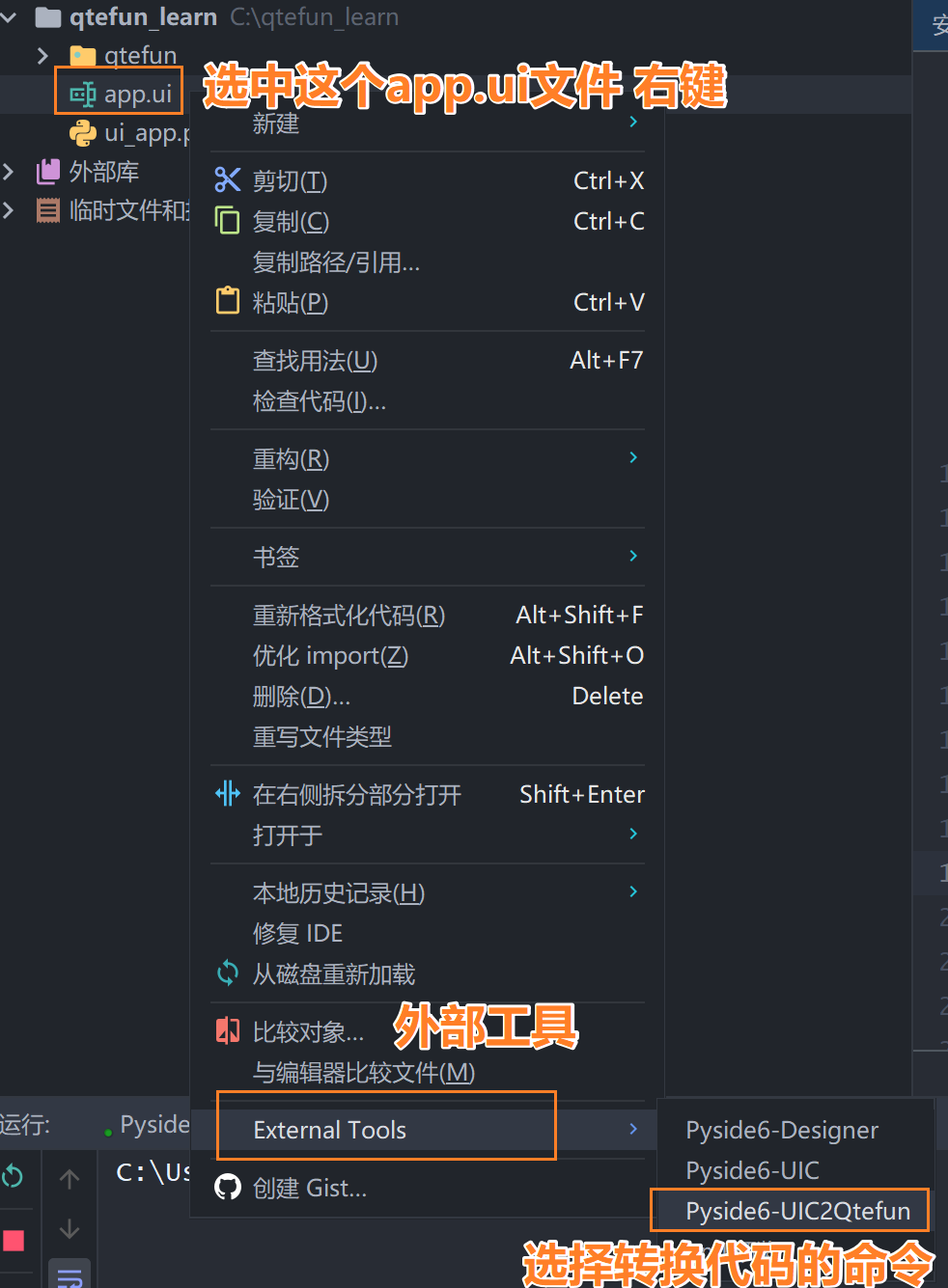 `python qtefun的绝对路径\\qtefun\\cmd\\qt代码加入qtefun.py app.ui ui_app.py "填绝对路径\\Anaconda3\\Scripts\\pyside6-uic.exe"`
