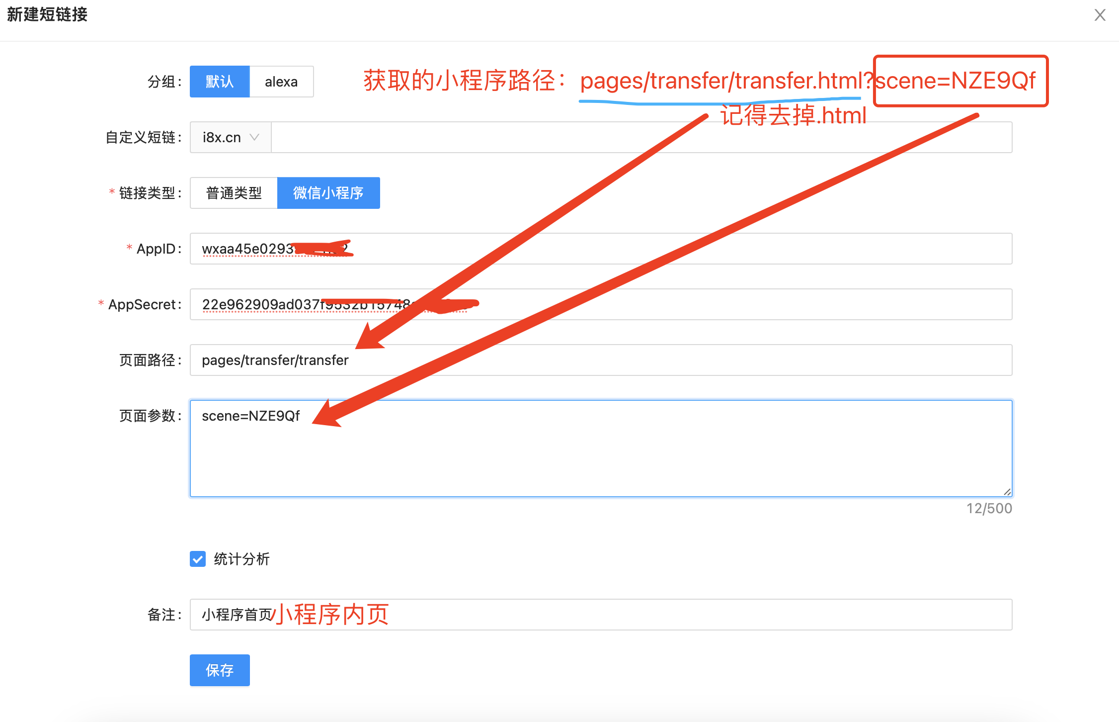 这这个路径里面是带问号的,同时我们要把小程序页面路径的.html给去掉,变成这样小程序路径:pages/transfer/transfer?scene=NZE9Qf 然后在我们平台填入,注意“?scene=NZE9Qf ”这个是小程序路径自带的参数,我们要分别来填,如下图所示