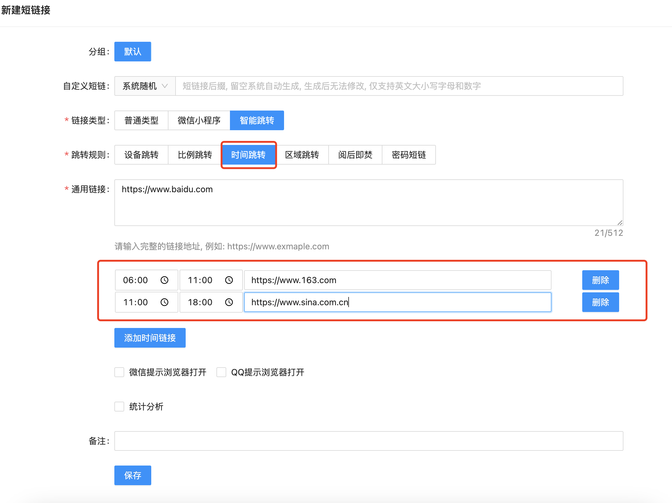 ## 如何创建时间短链接? 支持按不同的时间段跳转不同的长链接,~~~ 可以实现同一个短链接访问A\B链接,并且可以实现在某一个时间段访问A链接,另一个时间段访问B链接。如下图