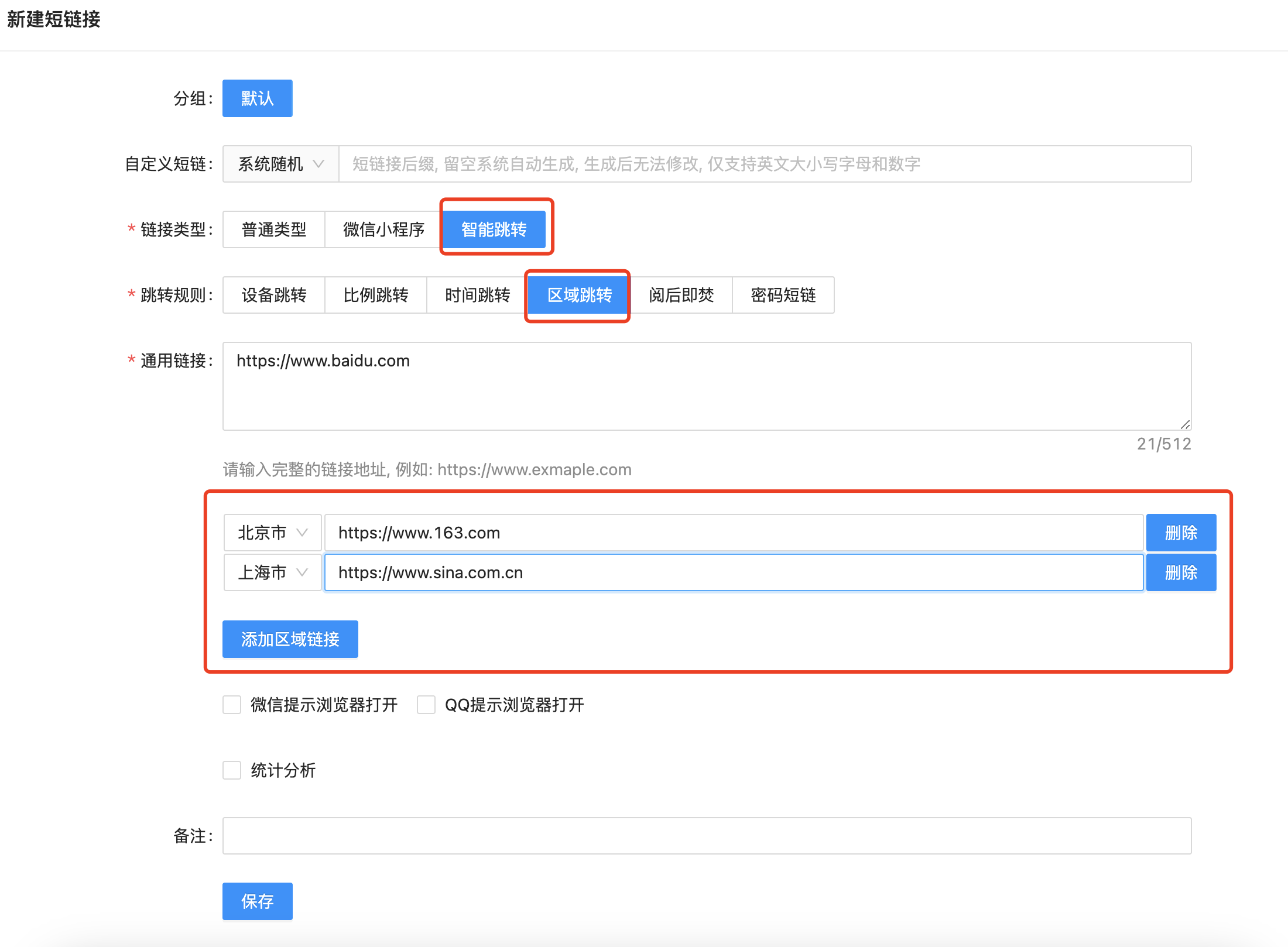 ## 如何创建区域短链接 支持按不同地区跳转不同的长链接,可以实现同一个短链接在A地区访问 baidu.com,在B地区访问 163.com。操作如下图:用户访问同一个短链接,北京的用户会跳转网易、上海的用户会跳转新浪