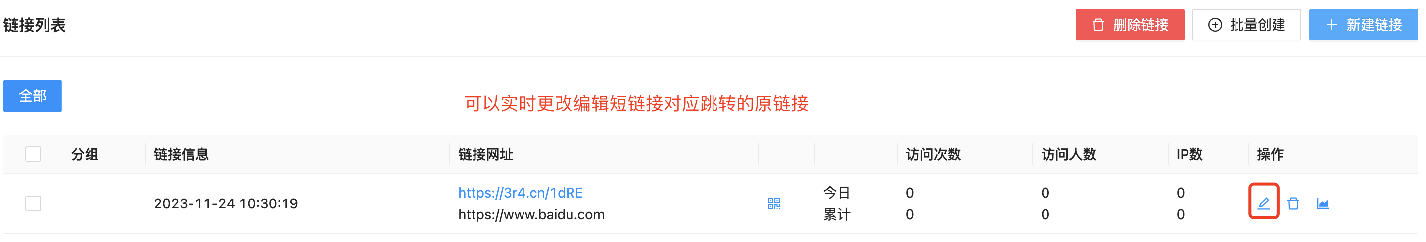 对于很多用户经常会遇到一种情况,比如拿短信群发场景来说,你带短链接的内容群发出去后,由于某种原因,你短链接对应跳转的落地链接如你的官网打不开了或服务器网络中断打不开了,没有办法去替换短链接对应的原链接,那么我们这个功能就是满足你可以实时更改短链接对应跳转的长链接。