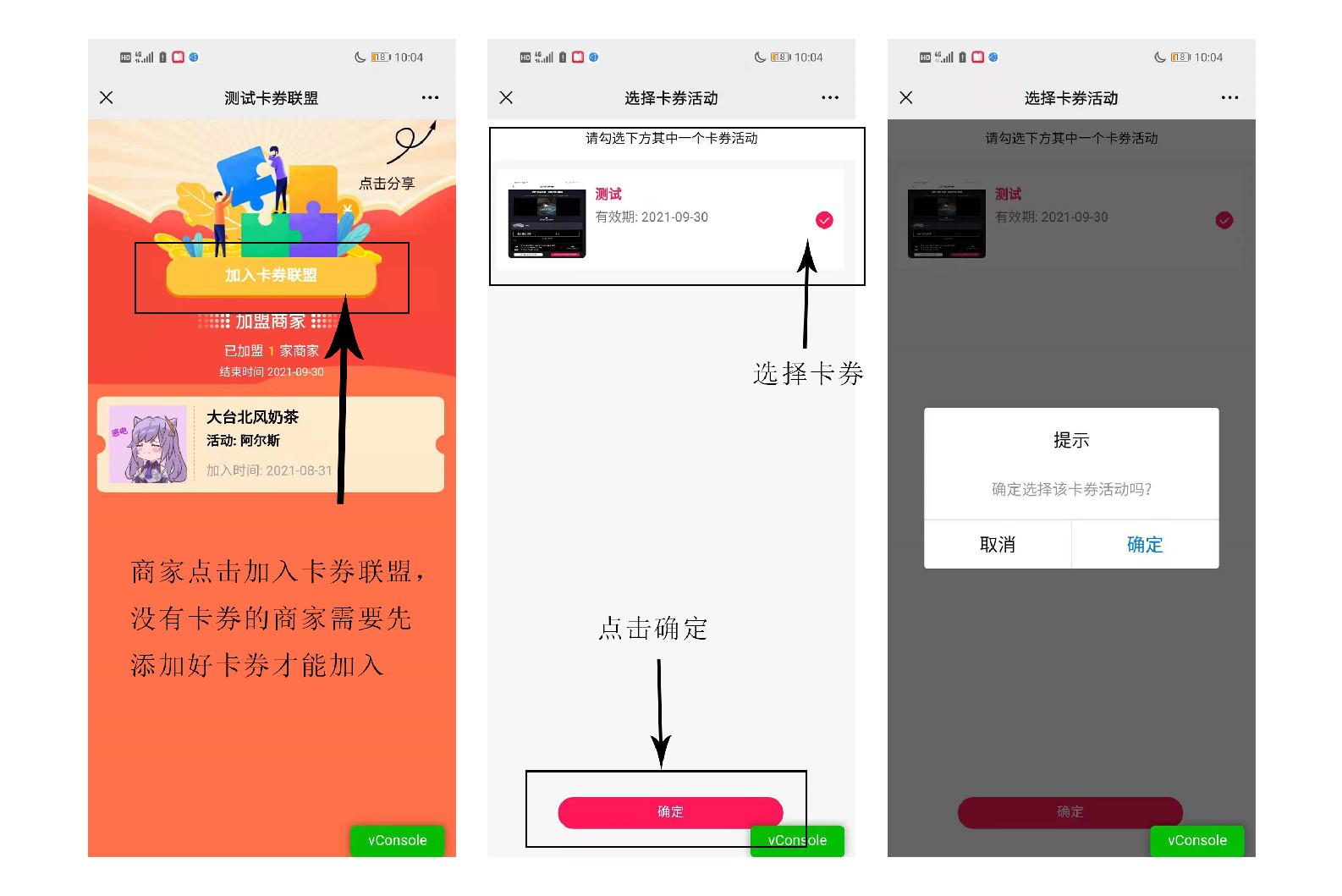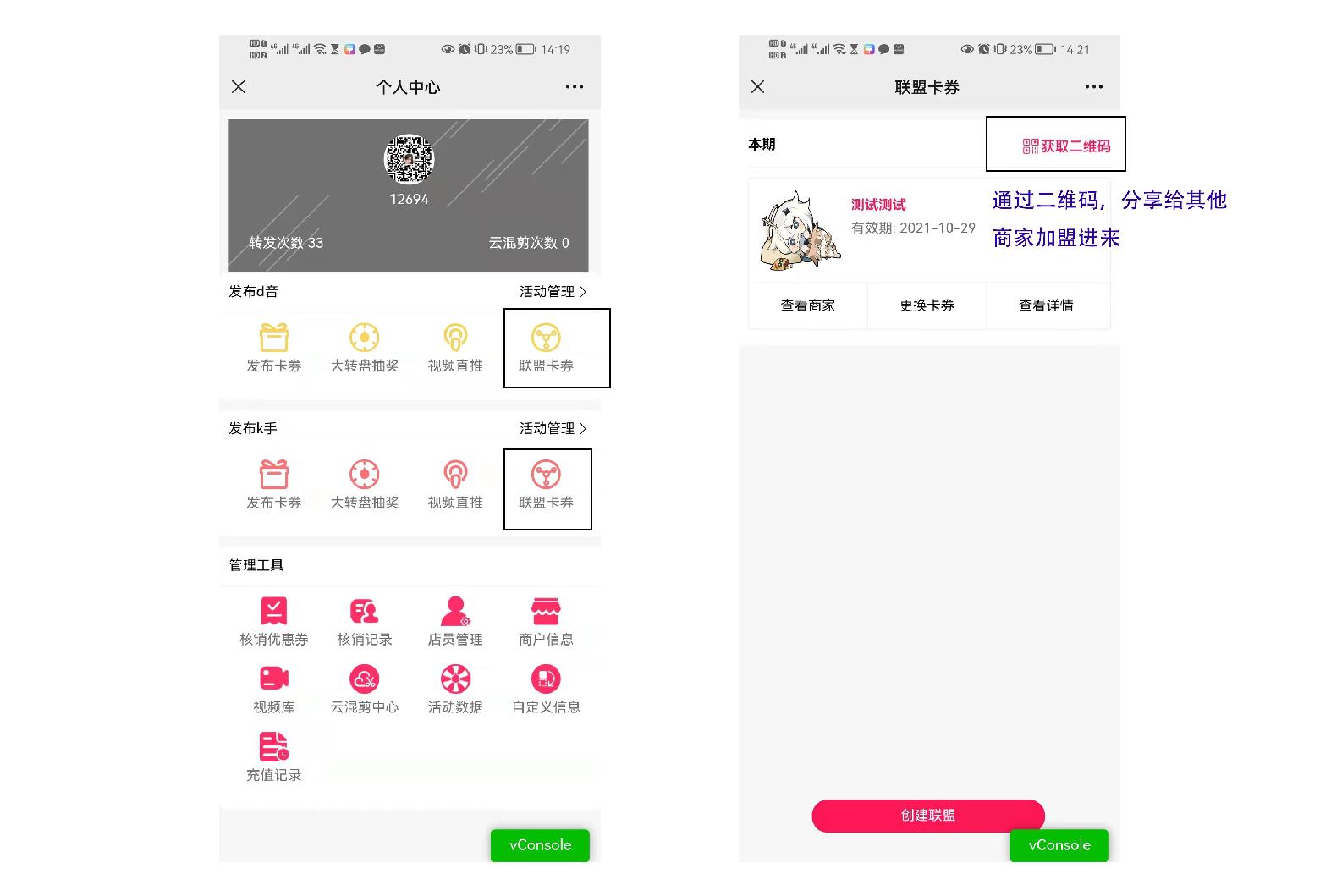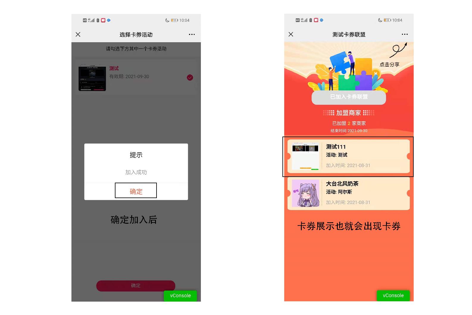 加入的商家自己的卡券联盟位置就会出现加入的卡券联盟活动。如下图所示