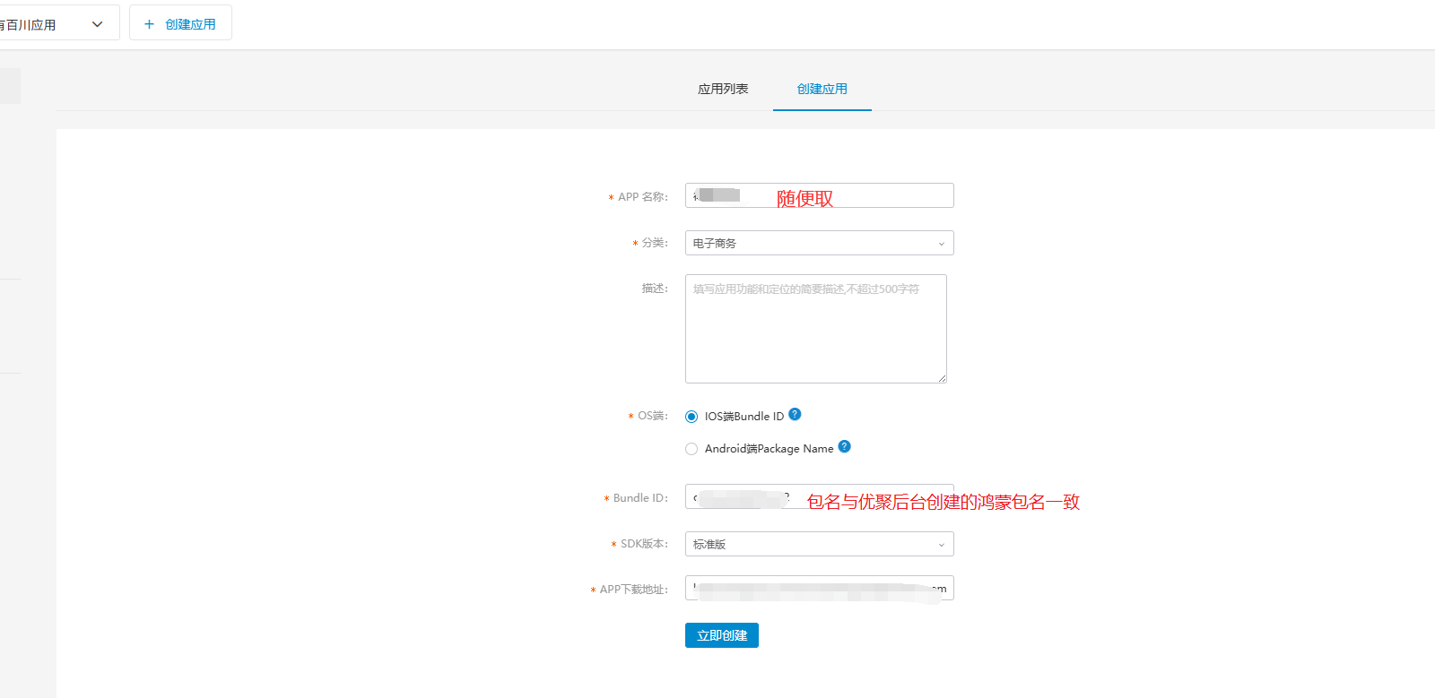 在百川后台新建一个IOS应用,点击创建应用-填写信息保存,**这里面创建时的Bundle ID填与优聚后台的鸿蒙证书包名一致**,三段式的。