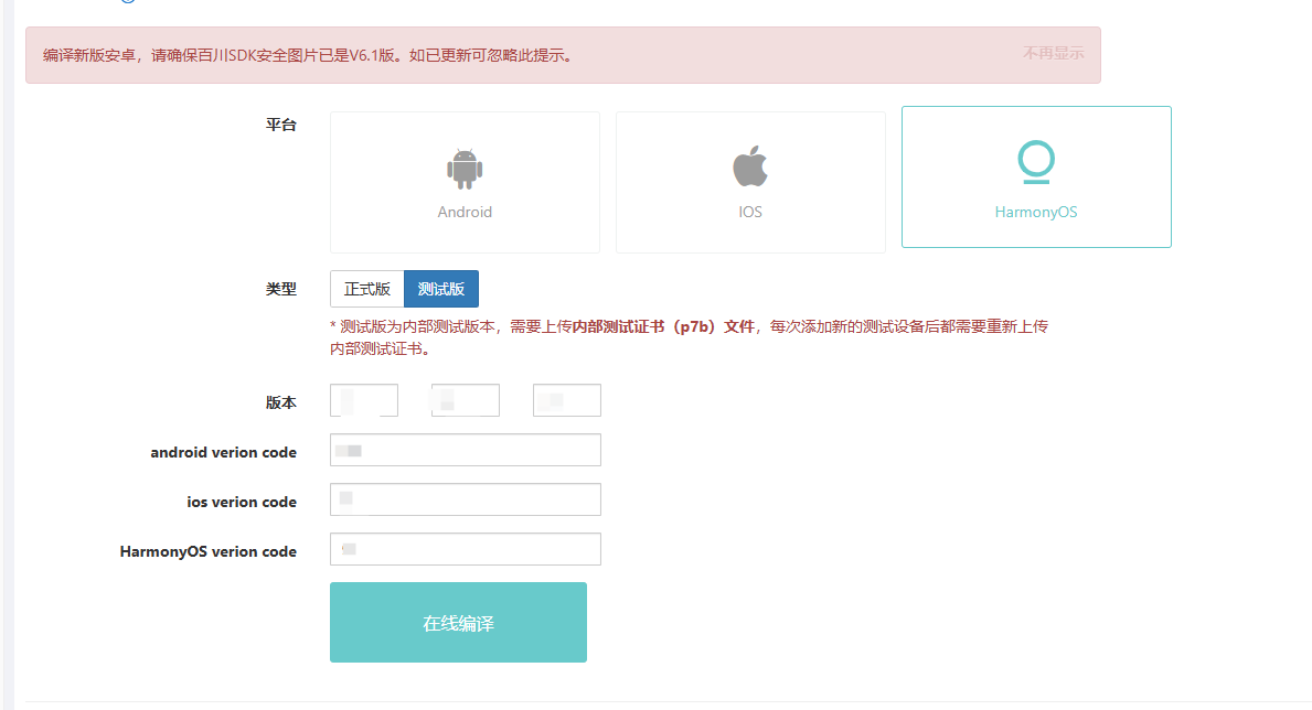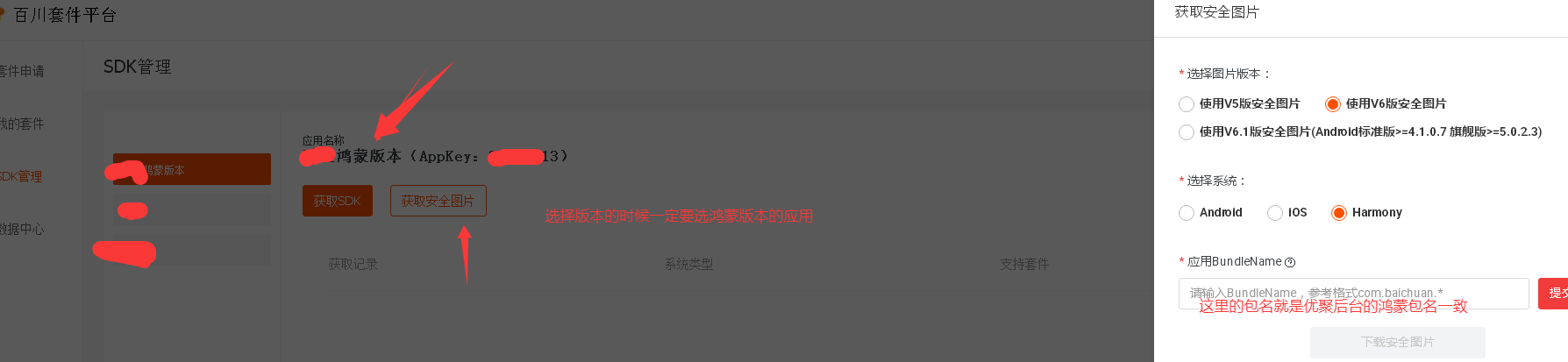 获取鸿蒙安全图片选择应用一定选择创建的鸿蒙应用版本,**鸿蒙百川使用V6安全图片**应用BundleName填优聚后台鸿蒙包名