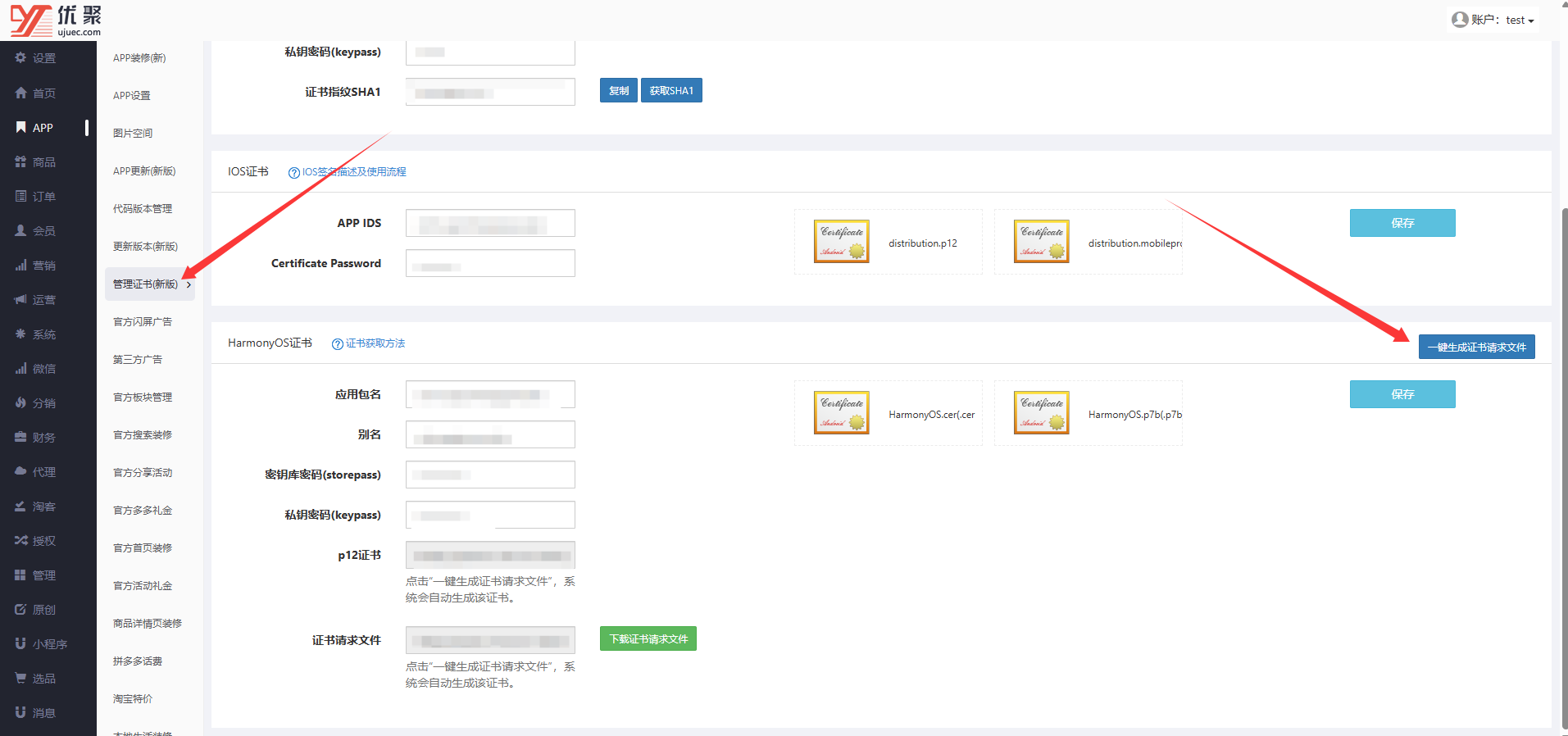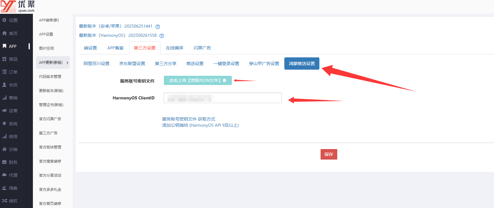 获取了下载提交到优聚后台上传保存,同时把鸿蒙appkey和appsecret数据复制填到优聚后台保存。