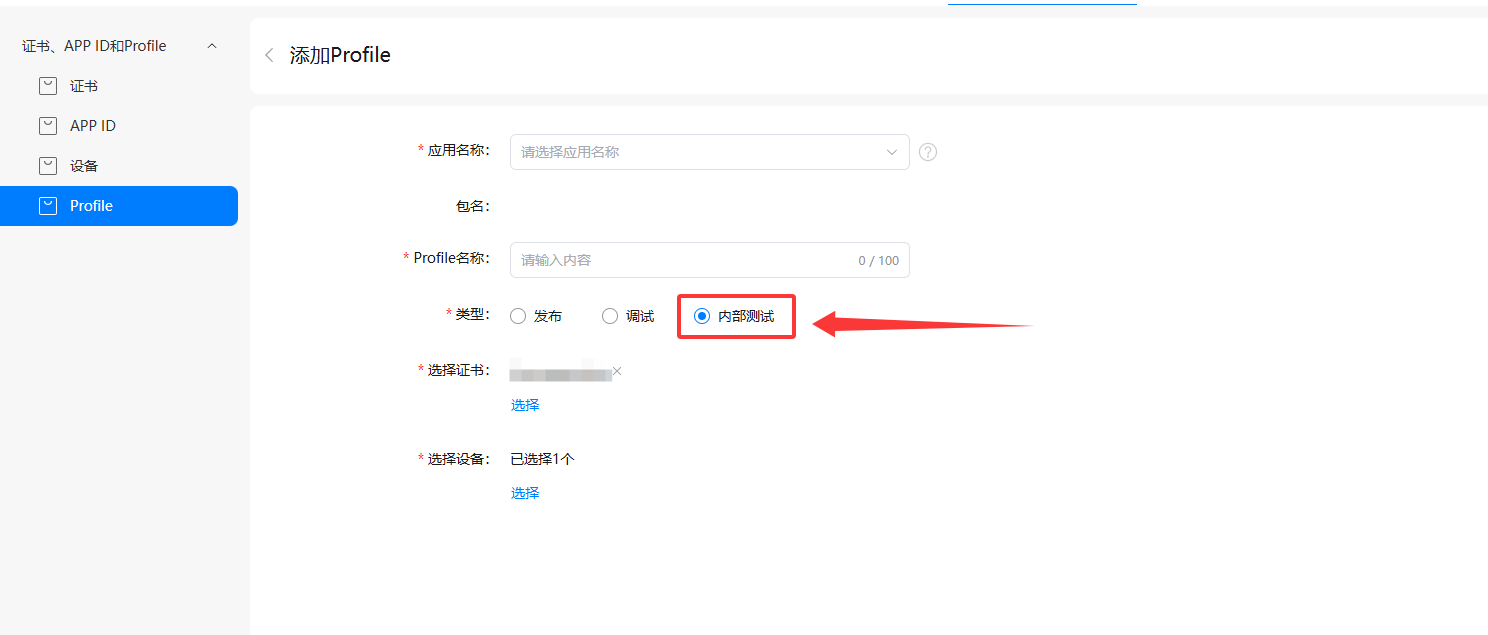 **内部测试证书**的申请和所需参数与正式的证书申请步骤一直,只是在添加Profile证书时,选择内部测试,添加相应的设备信息即可。