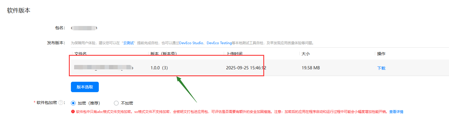 3、上传软件版本,选取需要上架的应用版本。