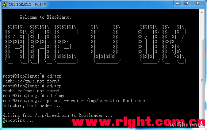 2. 上传后,使用putty登陆路由器。使用cd /tmp进入tmp目录