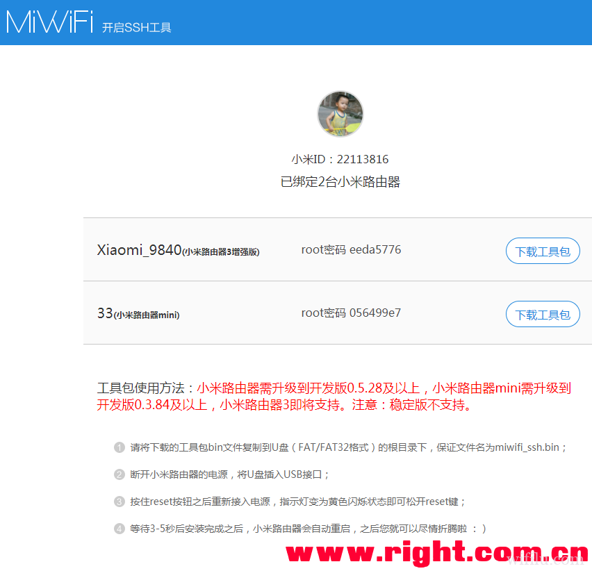 3. 绑定后,请登陆[http://d.miwifi.com/rom/ssh](http://d.miwifi.com/rom/ssh),如图,点击“下载工具包”