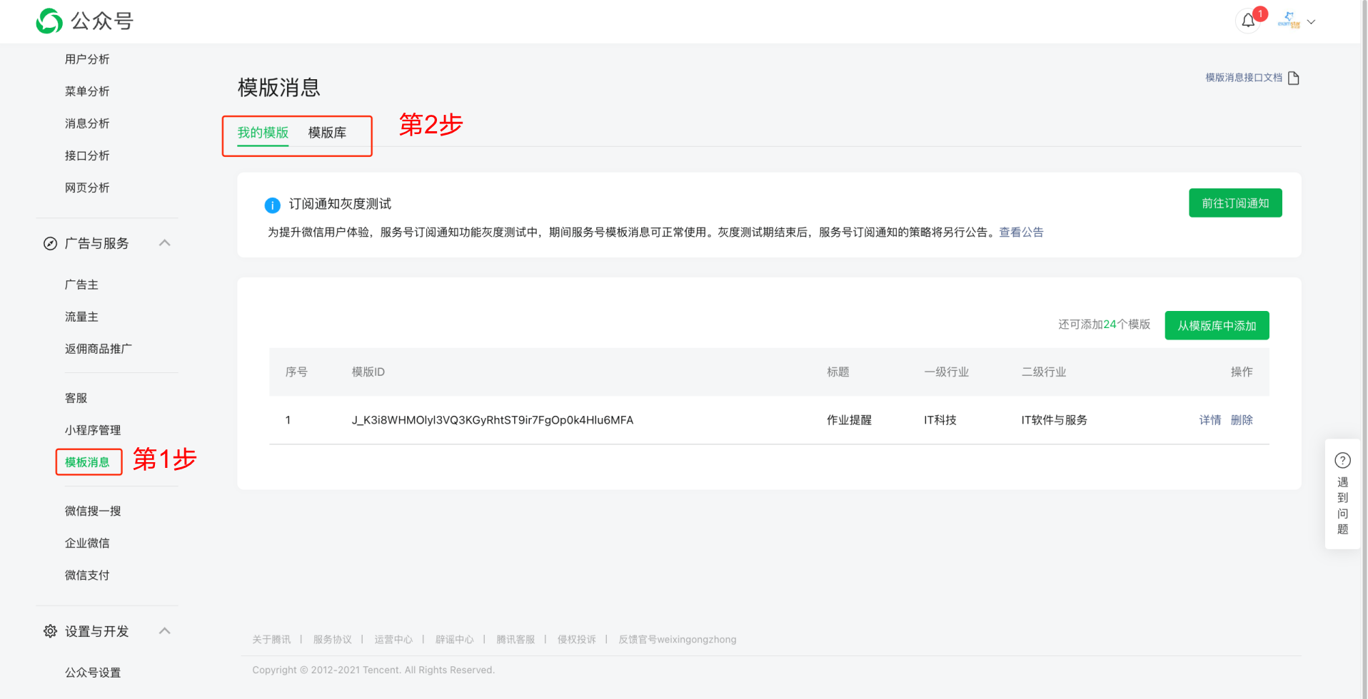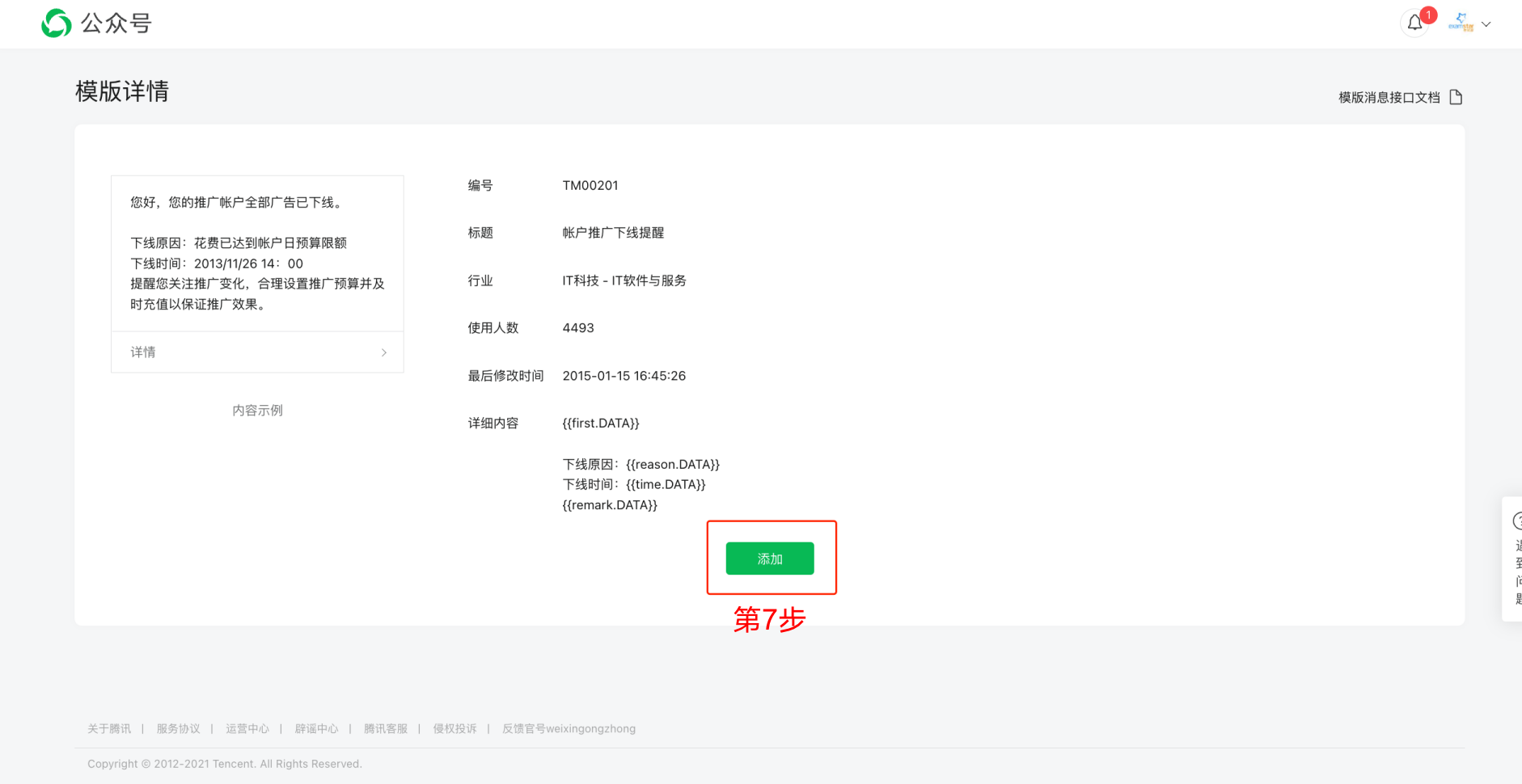 * 第7步:确认您所见到的模版与第7步图所示一致,点击添加,此模版将成功添加至您的模版中,返回第2步中的模版消息界面,即可看到您成功添加了此消息模版。