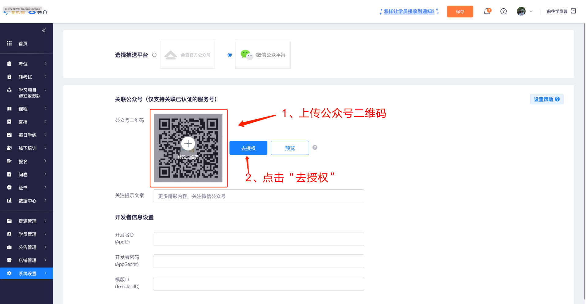 (页面将会跳转至公众平台账号授权界面。如后续需要修改关联的公众号,需重新上传二维码再次进行授权操作);