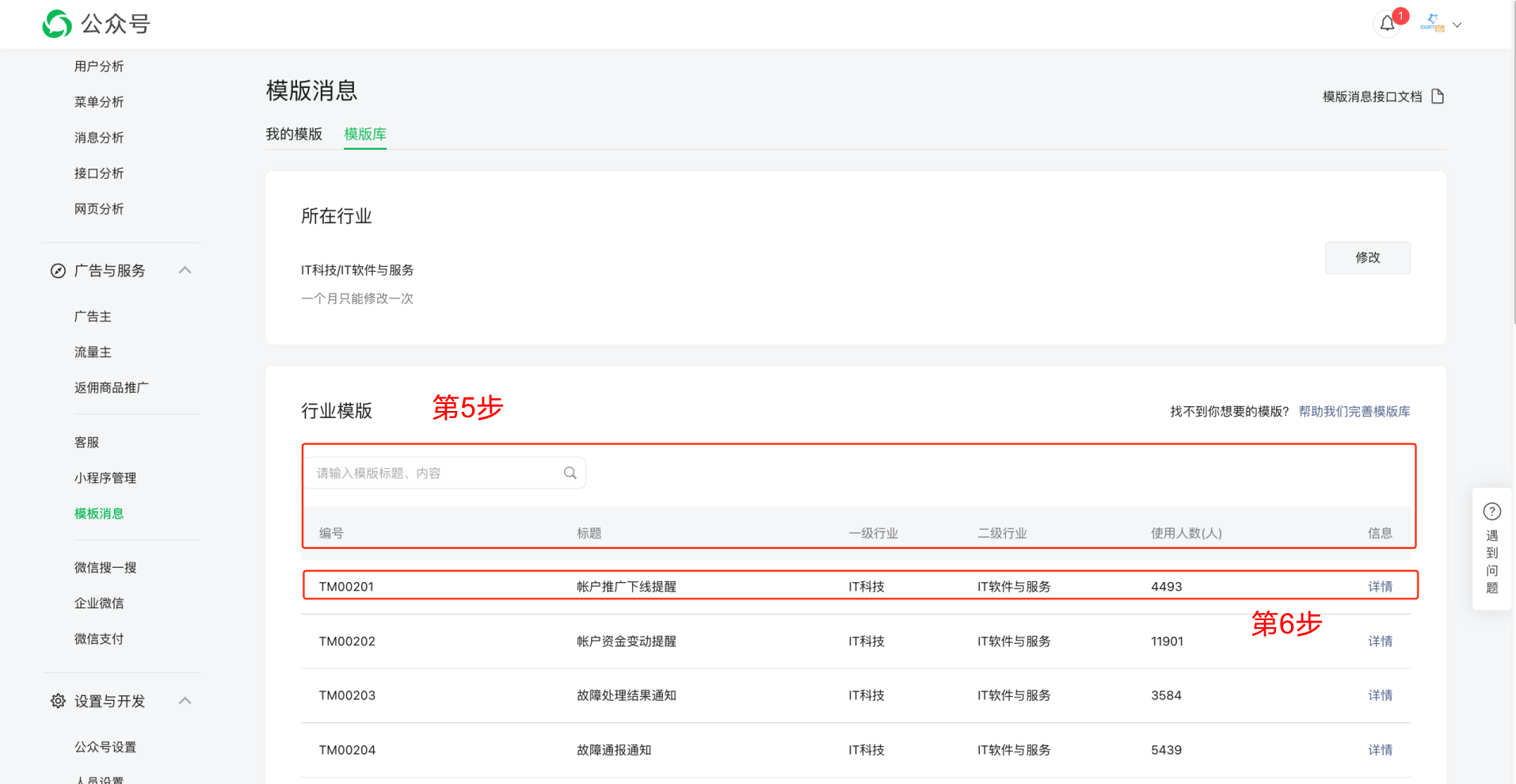 * 第5、6步:在行业模版的搜索框处,输入“作业提醒“,点击搜索框右侧的搜索按钮,在下方列表中找到编号为“OPENTM207331558“的行业模版,点击详情。