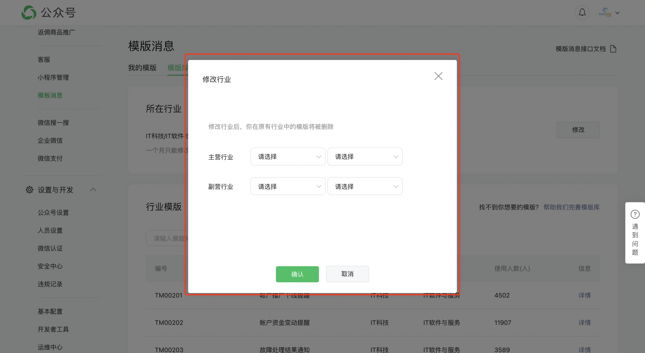 * 第3、4步,如果您的所在行业不包括“IT科技/IT软件与服务“,点击“修改“按钮,在修改行业的弹框中,将“主营行业“或者“副营行业“设置为“IT科技“+“IT软件与服务“,点击确认保存;