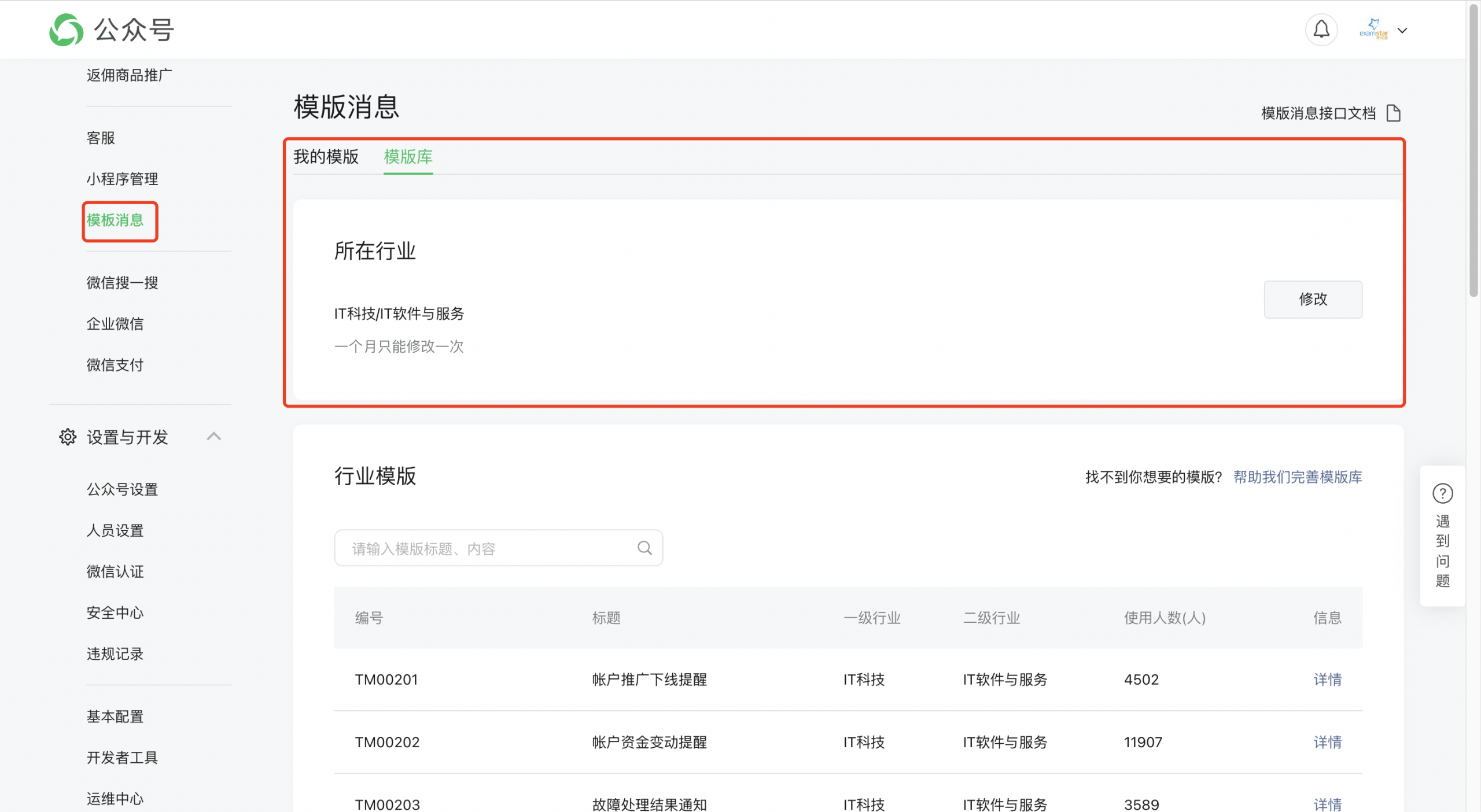 消息推送模块需要添加模版消息,后续消息推送将会根据您在会否配置的模版ID进行消息推送。