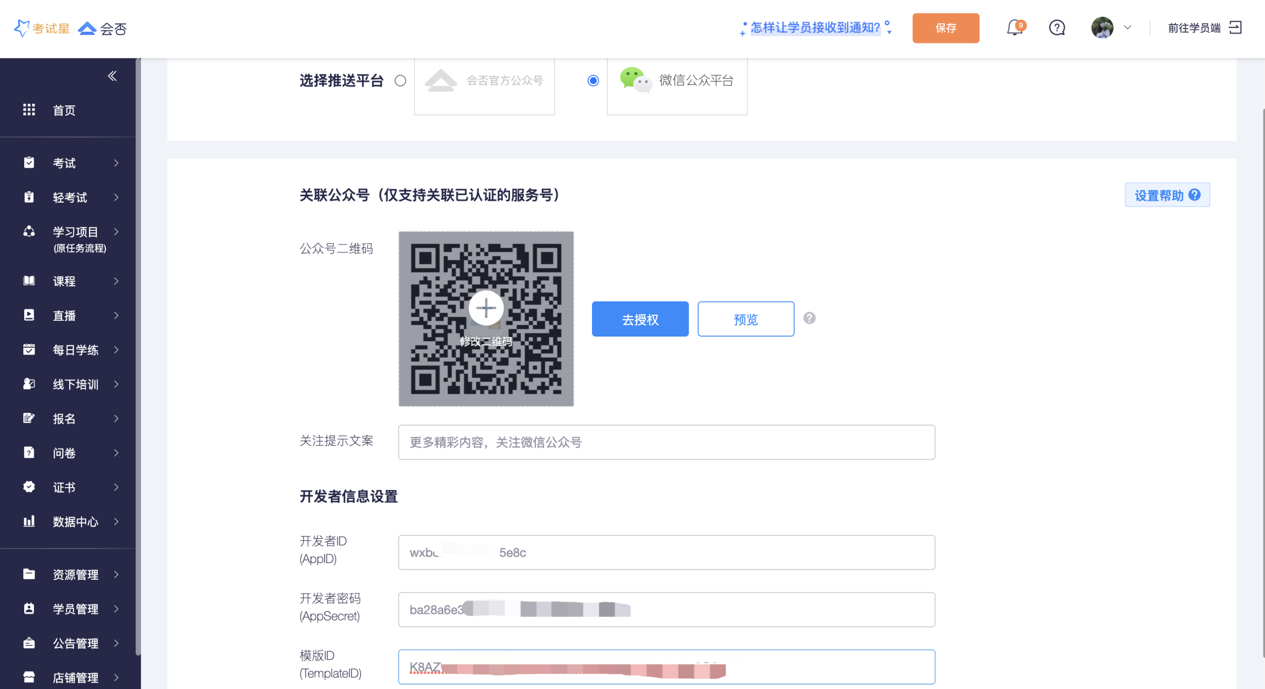 ### 3.1开发者信息设置:填写开发者ID、开发者密码、模版ID,