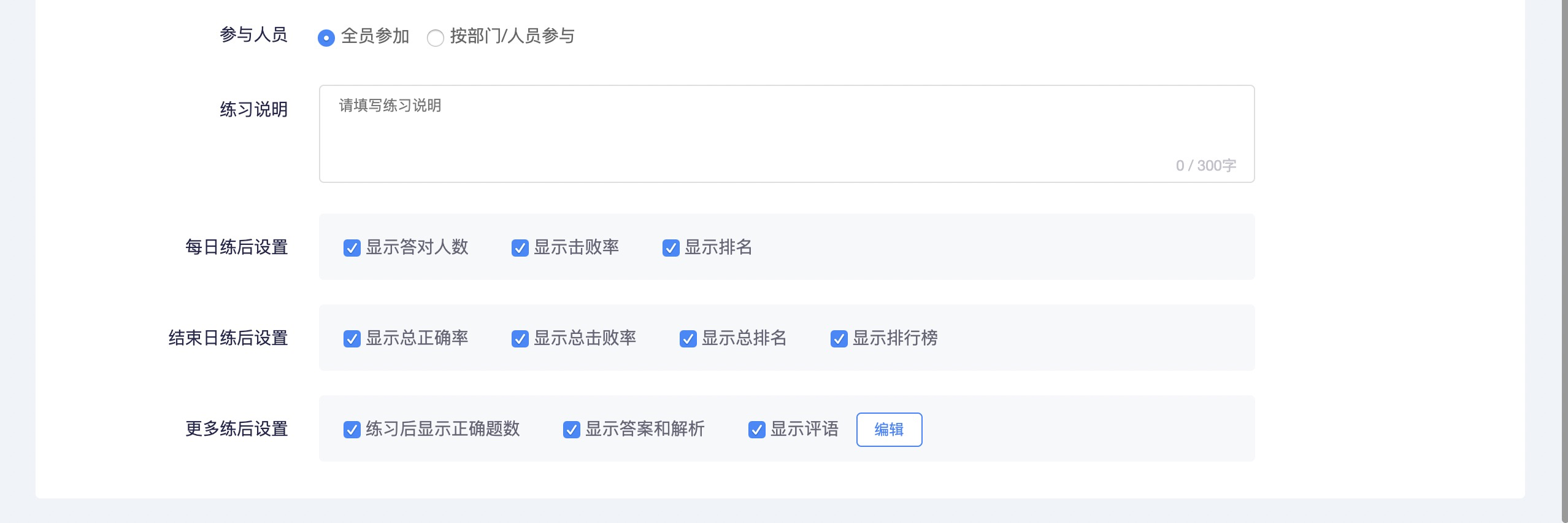 **每日练后设置**:可设置学员每日练习后的答对人数,击败率,排名是否显示;
