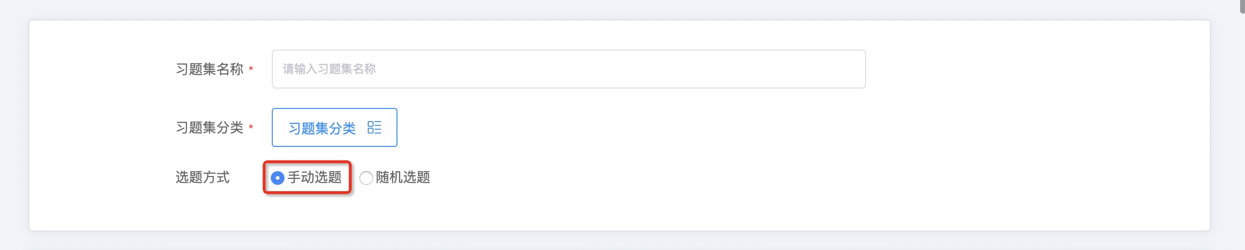 首先填写习题集基本信息,习题集名称、习题集分类,选择选题方式,分为手动选题,随机选题;