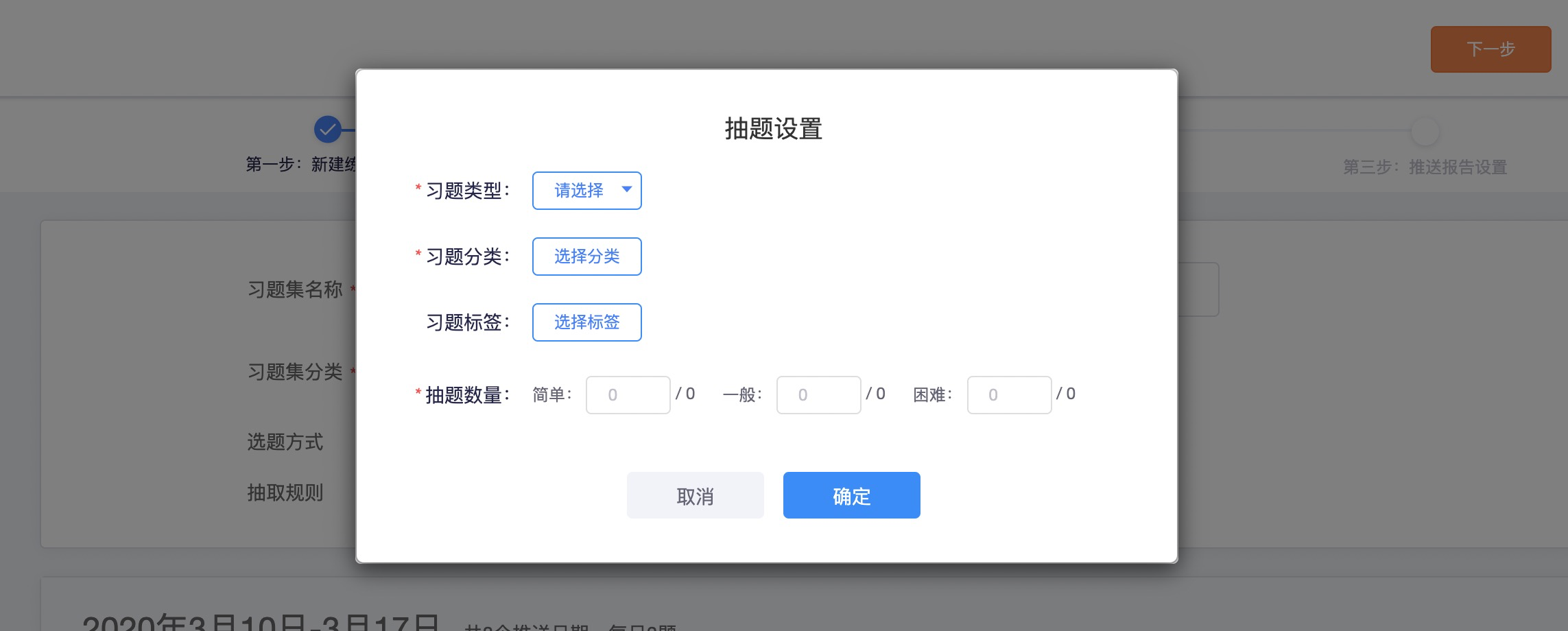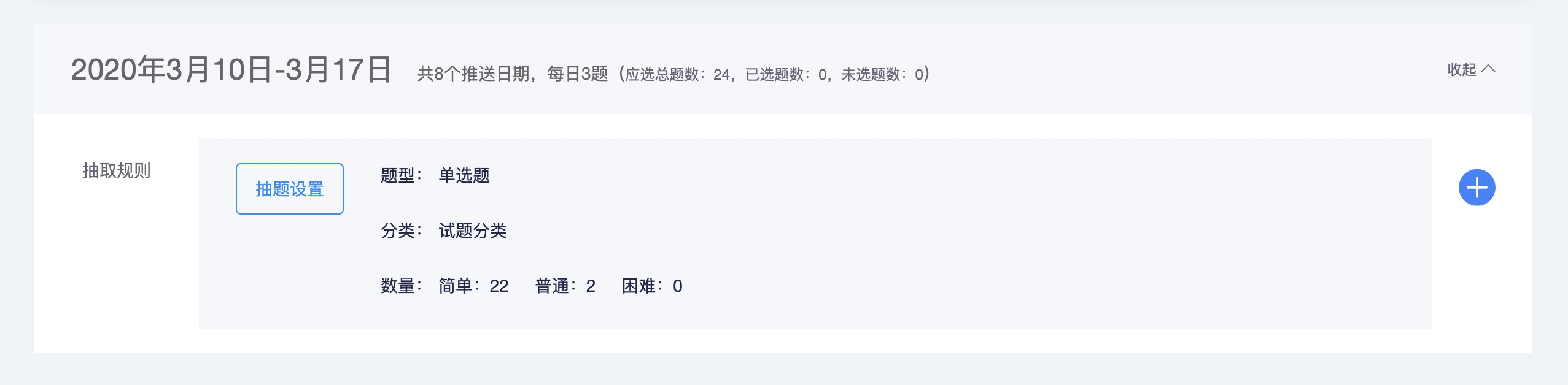 > **抽题设置**:根据选择的练习天数和每日练习题数,进行抽题设置,可以设置多个抽取规则。抽题规则必选习题类型、分类、抽题数量,标签为非必选项,可按需使用;