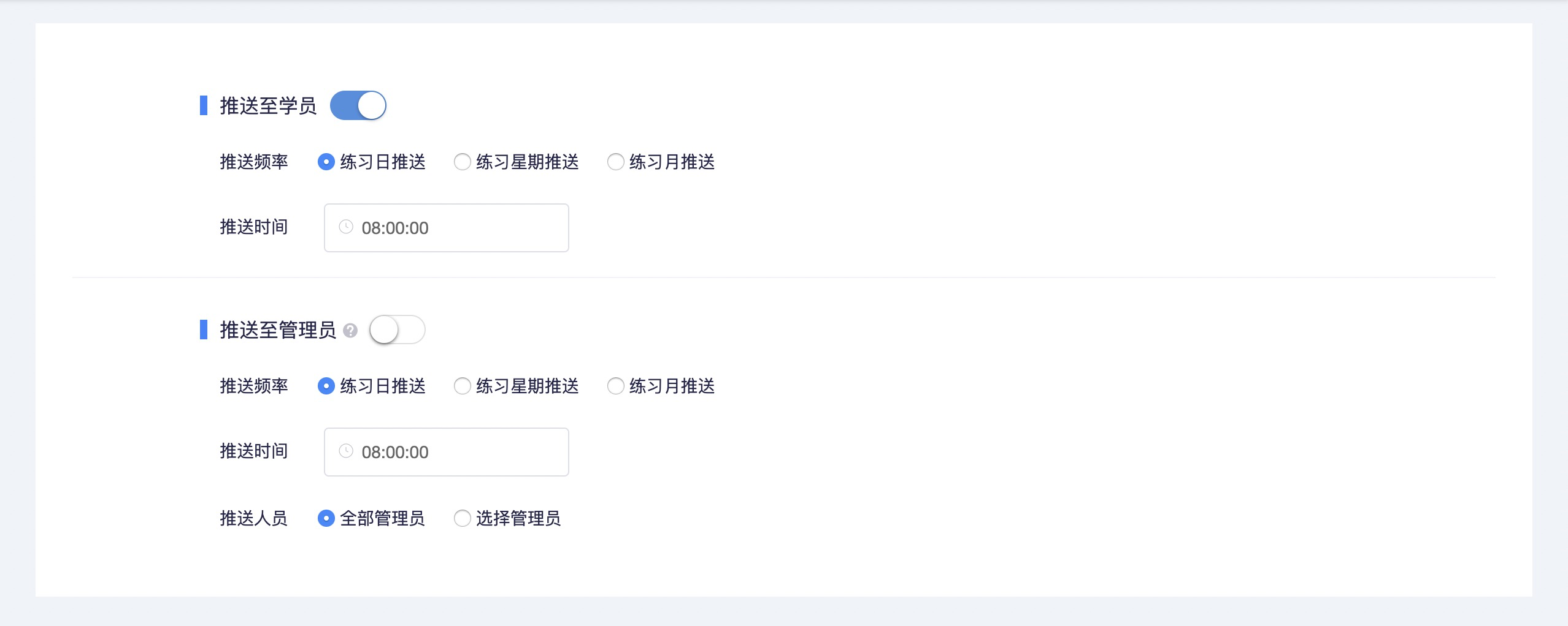 **推送频率**:练习日推送(推送练习的日期都会推送报告,为日报告)、练习星期推送(设置一周的某一天推送报告,为周报告)、练习月推送(设置一个月中的一天推送报告,为月报告);