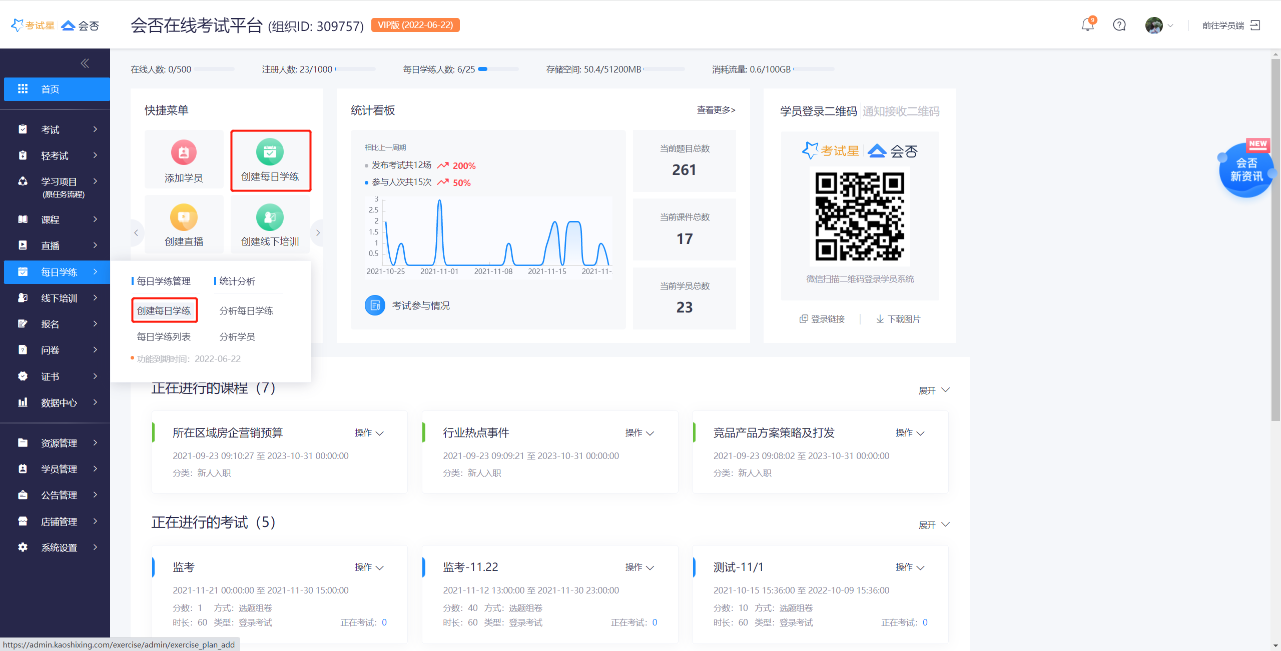 每日学练是一个可配置的高度自由化的学练功能,完成配置即可定期定时接收练习推送,并且能够推送可视化的数据报告,练习数据、学员数据多维度进行统计分析;