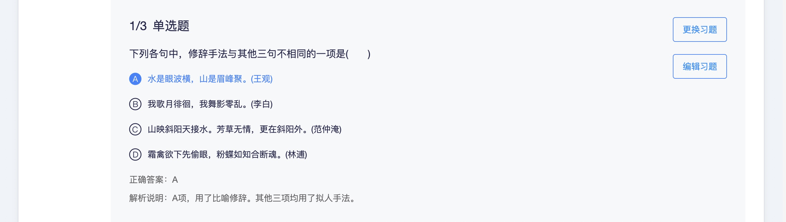选择的习题会显示题目、选项、答案、解析,支持更换和编辑习题;