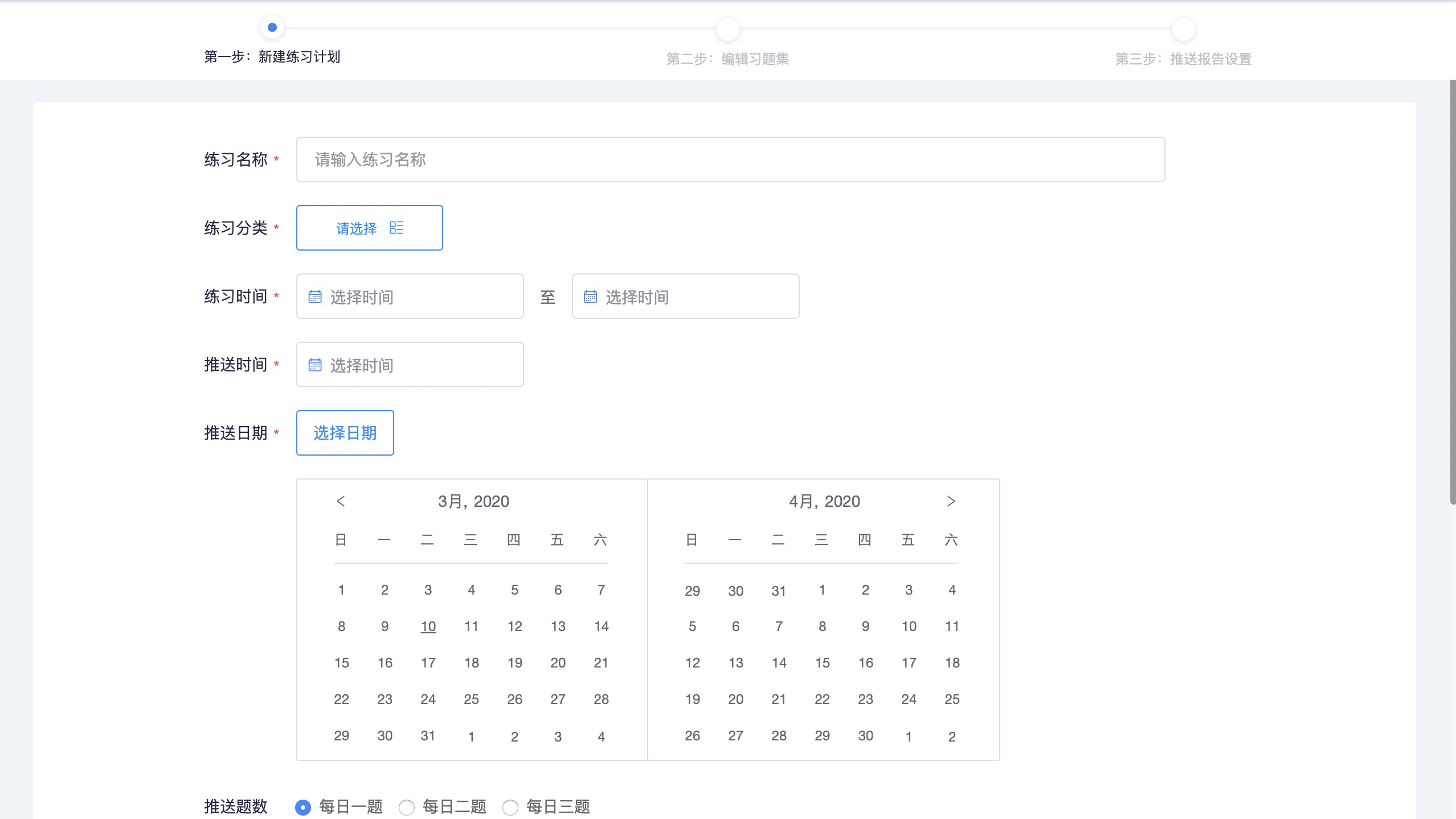 **推送日期**:本场练习计划的起止时间,可以选择开始到结束的时间范围,可按需设置法定节假日是否推送/按星期推送,也可在右侧日历表上手动点击选择推送日期;