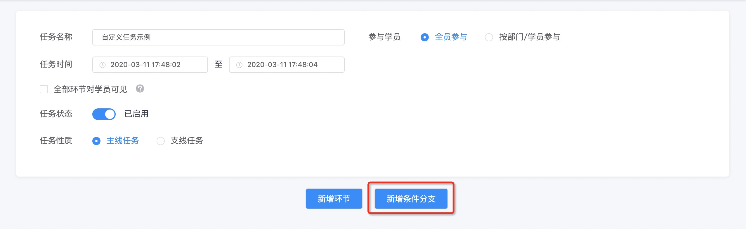 **任务性质**:可选择为主线任务或者支线任务,主线任务中可以关联支线任务,设置最多三个完成条件,只有学员满足所有条件之后才可以开启支线任务;