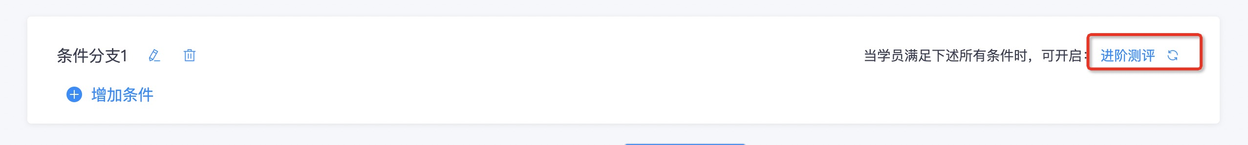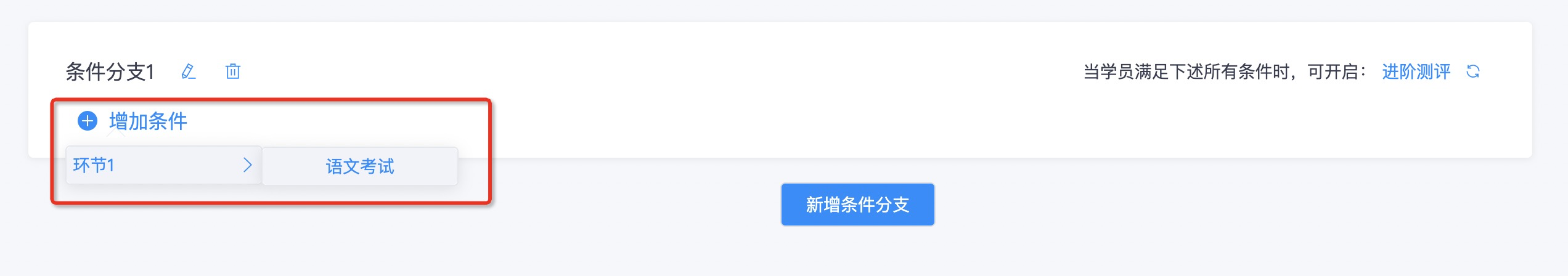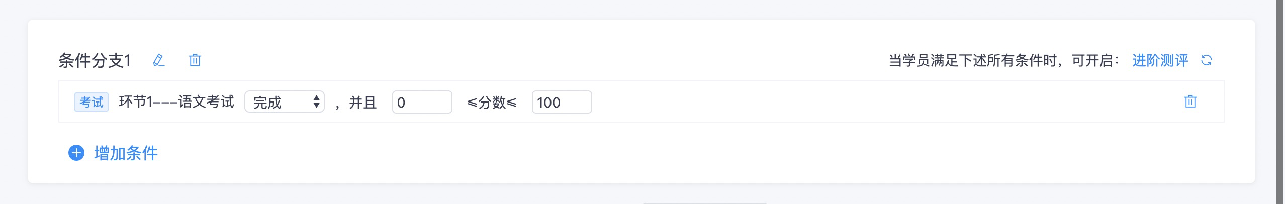 3.点击 \*\*增加条件 \*\*,选择主线任务中的一个环节作为前置条件,4.设置分支任务的完成条件,例如:完成主线任务「进阶测评」,并满足分数在80-100间,可开启支线任务;