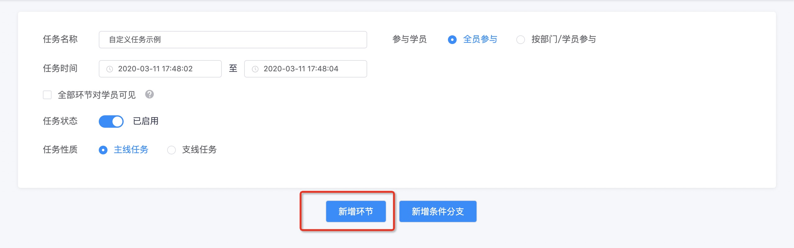 首先完善自定义任务的基本信息,名称、时间、状态、性质与参与学员;
