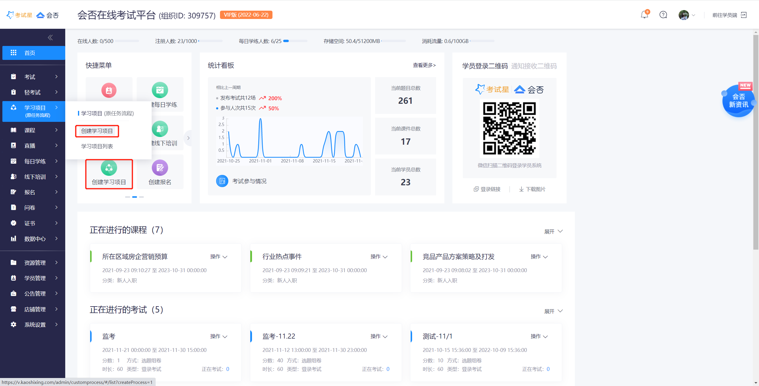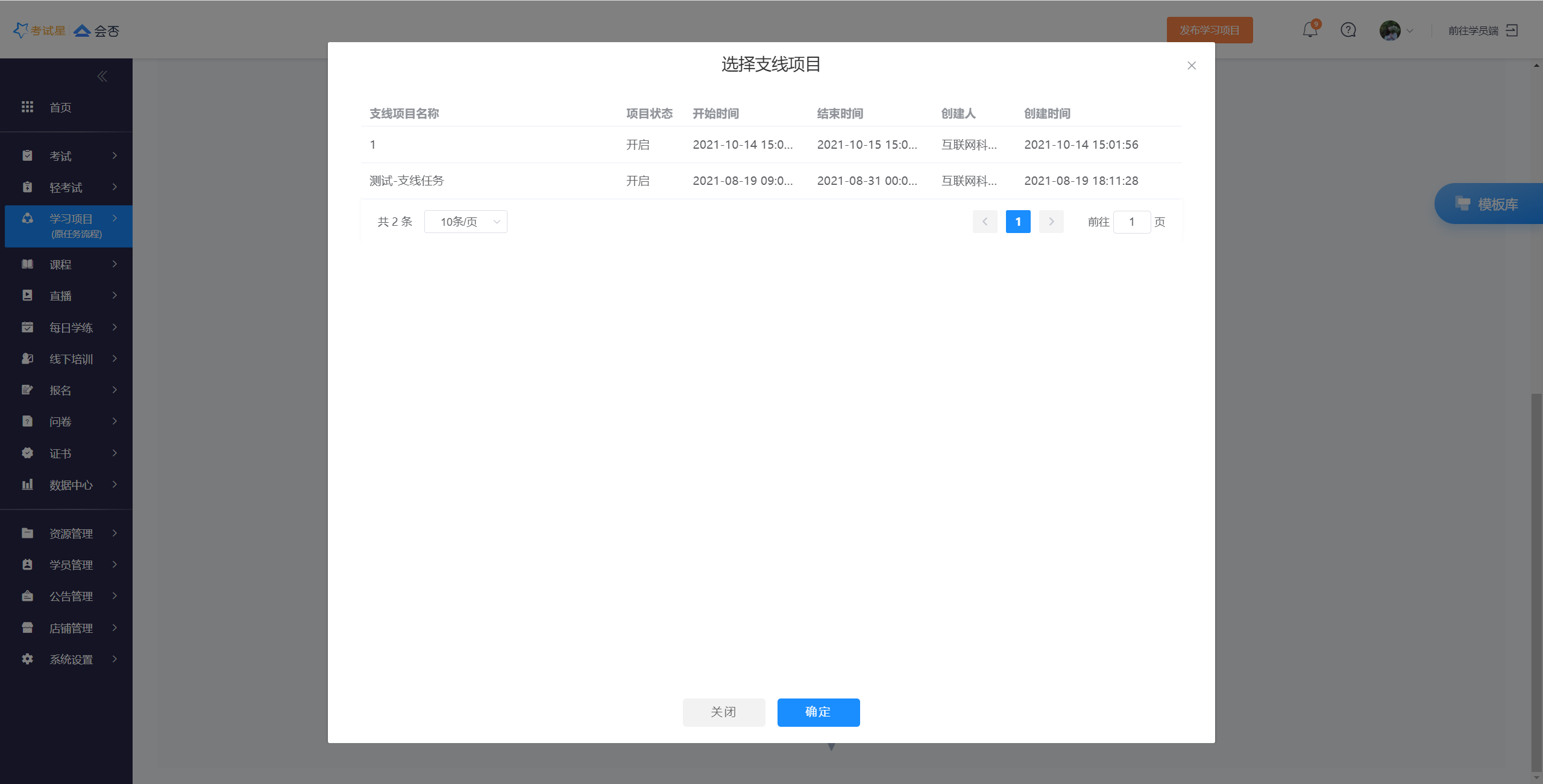 3.现在开始添加新任务,可添加多项考试、报名、课程,可添加证书和红包发放和学员支付(在此以考试为例);