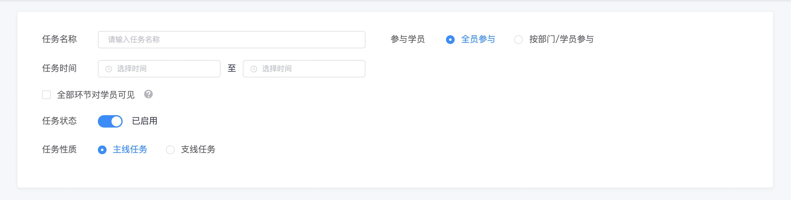 **参与学员**:可设置本场考试全员参与或者按部门/学员参与;可考部门:针对公司多个部门多种情况,这里可勾选不同的部门;可考学员:手动勾选可以参加的学员,也可以批量导入,支持一键清空;可考标签:只有满足所选标签的学员才可以参加任务流程,可以选择存在所有所选标签的学员参加(例如已选标签“A、B、C”,同时存在“A、B、C”三个标签的学员将可参加此任务),也可以选择存在所选任意一个表情的学员参加(例如已选标签“A、B、C”,则至少有任意一个标签的学员均可参加此任务)。