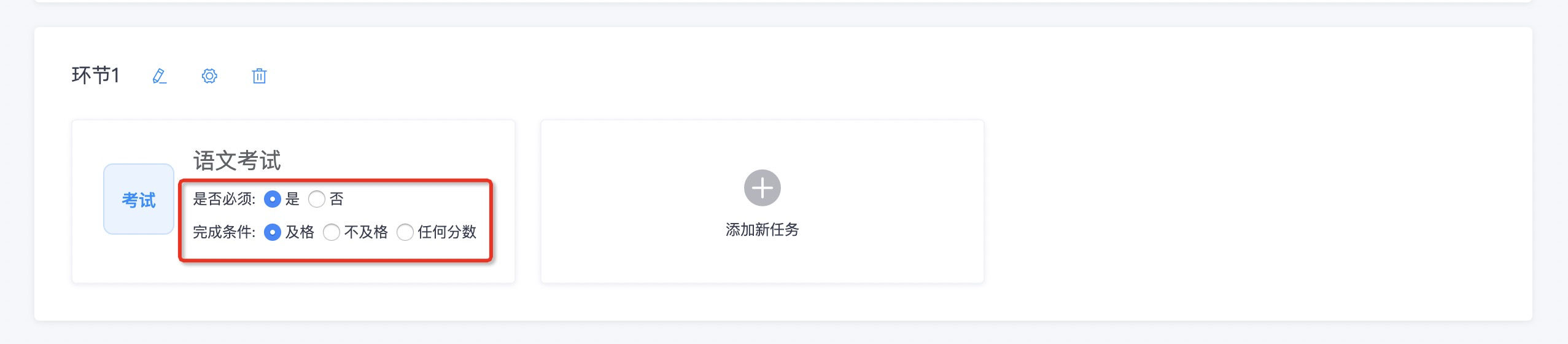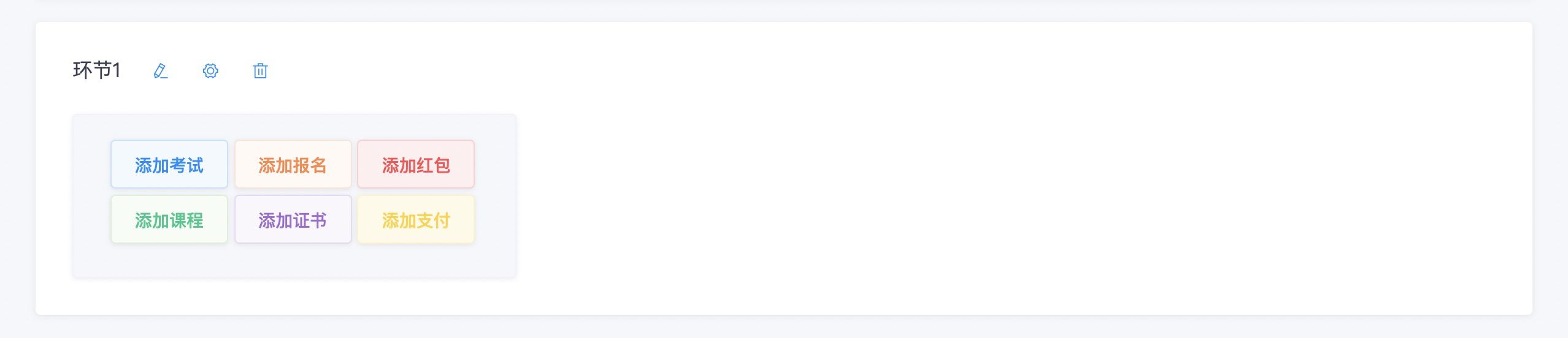 > 可以将报名、学习、考试、证书、支付、红包,以任务的形式发布出来,分布在不同的环节里。管理员通过创建一系列的环节构成一个自定义流程任务,使得考生按设定的任务方案一个环节接一个环节完成。