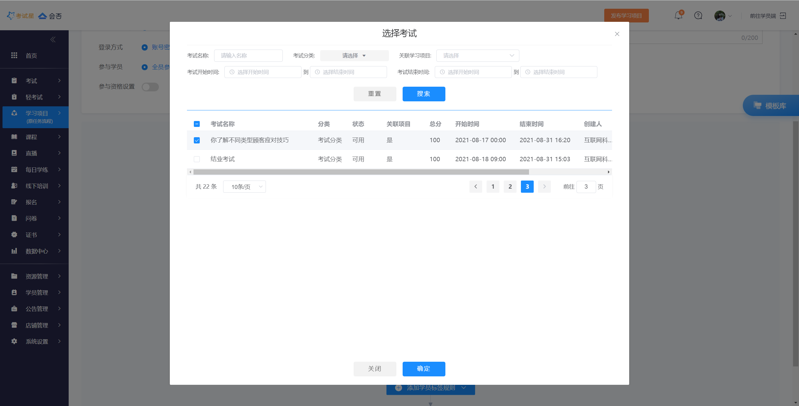 选择一场考试(可在上方进行简单的名称关键词和时间范围快速查找)