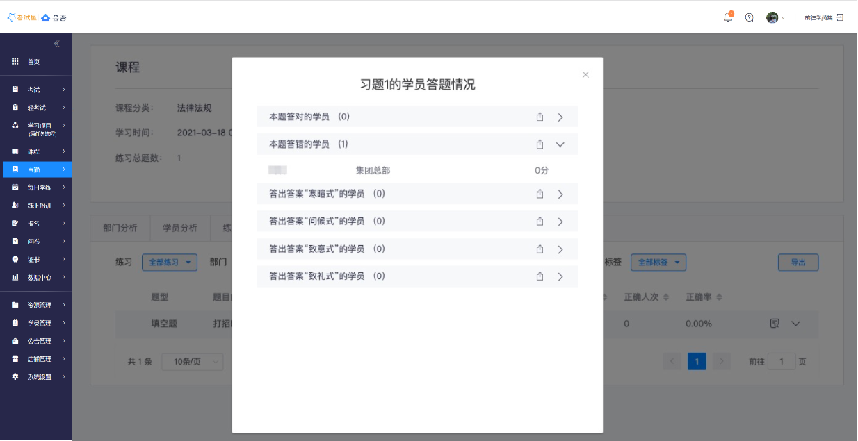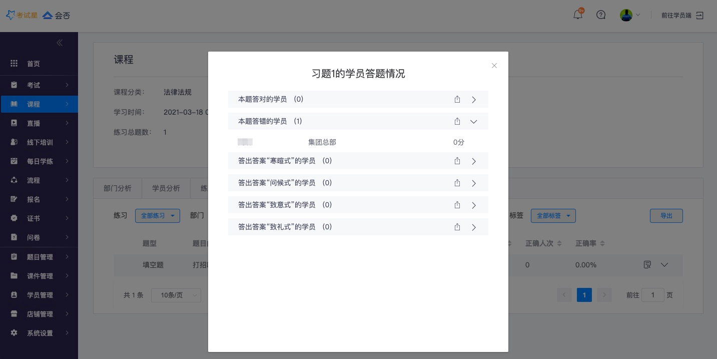 在【课程管理 - 分析课程 - 学员分析】,可以查看学员在课程学习中,每次答题的记录,查看对了哪些题错了哪些题,便于针对学员重点观察