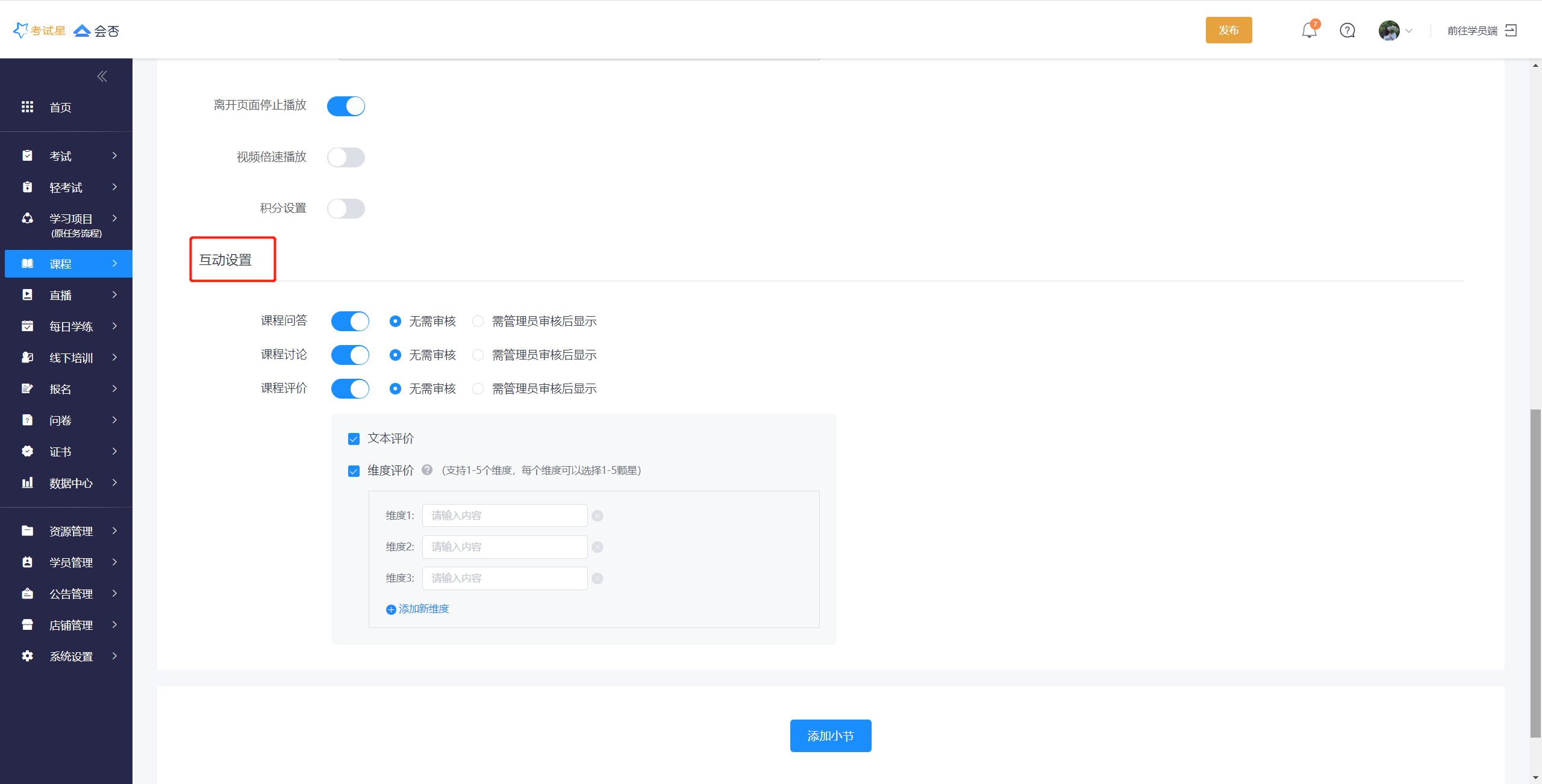 * 课程评价:学员学完课程后,可对课程进行评价;管理者也可设置评分维度,学员评价时针对各个维度评分,例如:课程质量、讲师水平等维度